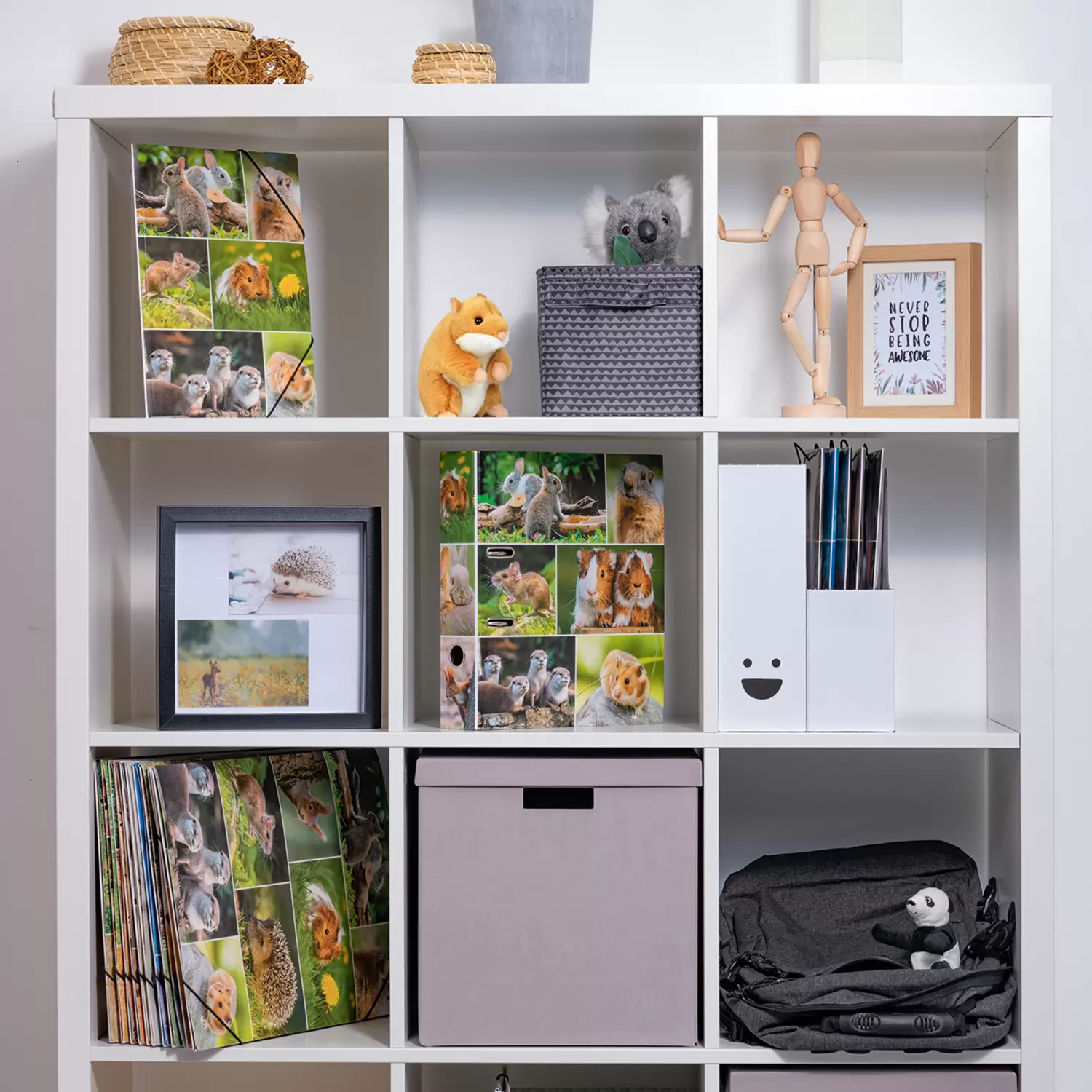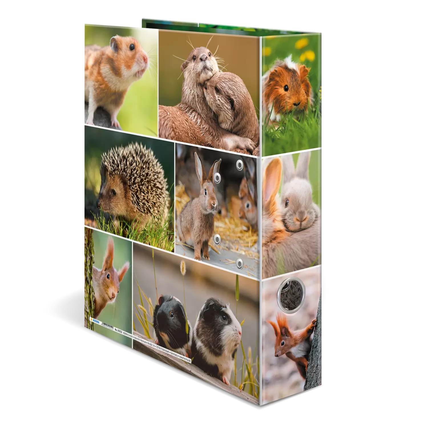 DIN A4 thema-ordner met prachtige foto's van knaagdieren. Van de partij zijn schattige hamsters, cavia's en konijntjes, grappige otter en eekhoorntjes en nog veel meer! Leuk voor dierenliefhebbers en iedereen die graag naar het bos gaat. De ordner is hoogwaardig gemaakt van stevig karton, met handig vingergat en hefboommechanisme (incl. klem), bedrukt aan de binnenzijde, voor het optimaal opbergen van geperforeerde documenten en transparante hoezen. Voor optimale orde thuis, op school, universiteit of op kantoor en tegelijkertijd een echte blikvanger.