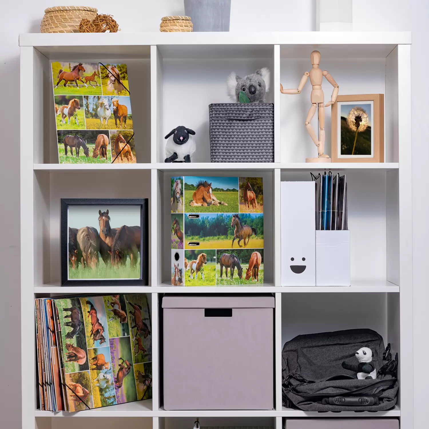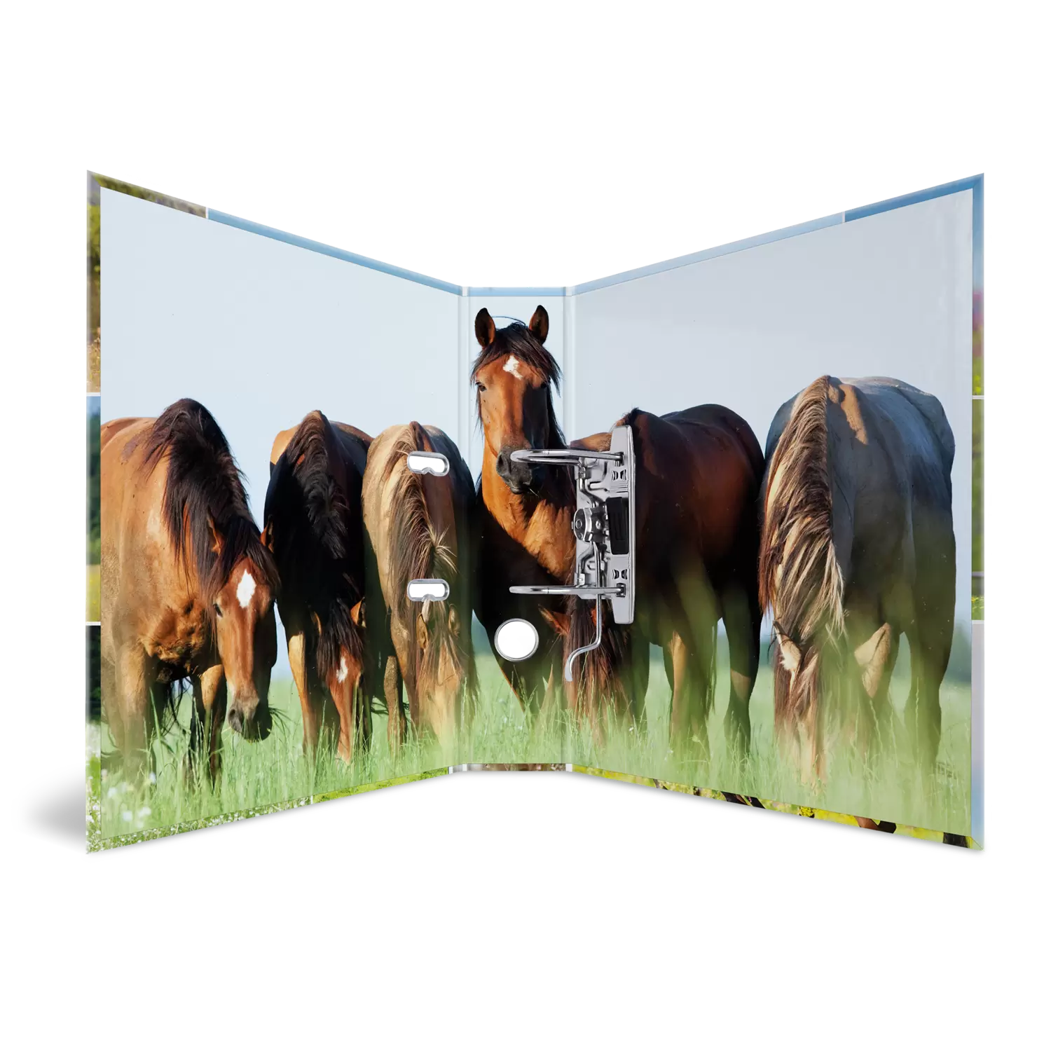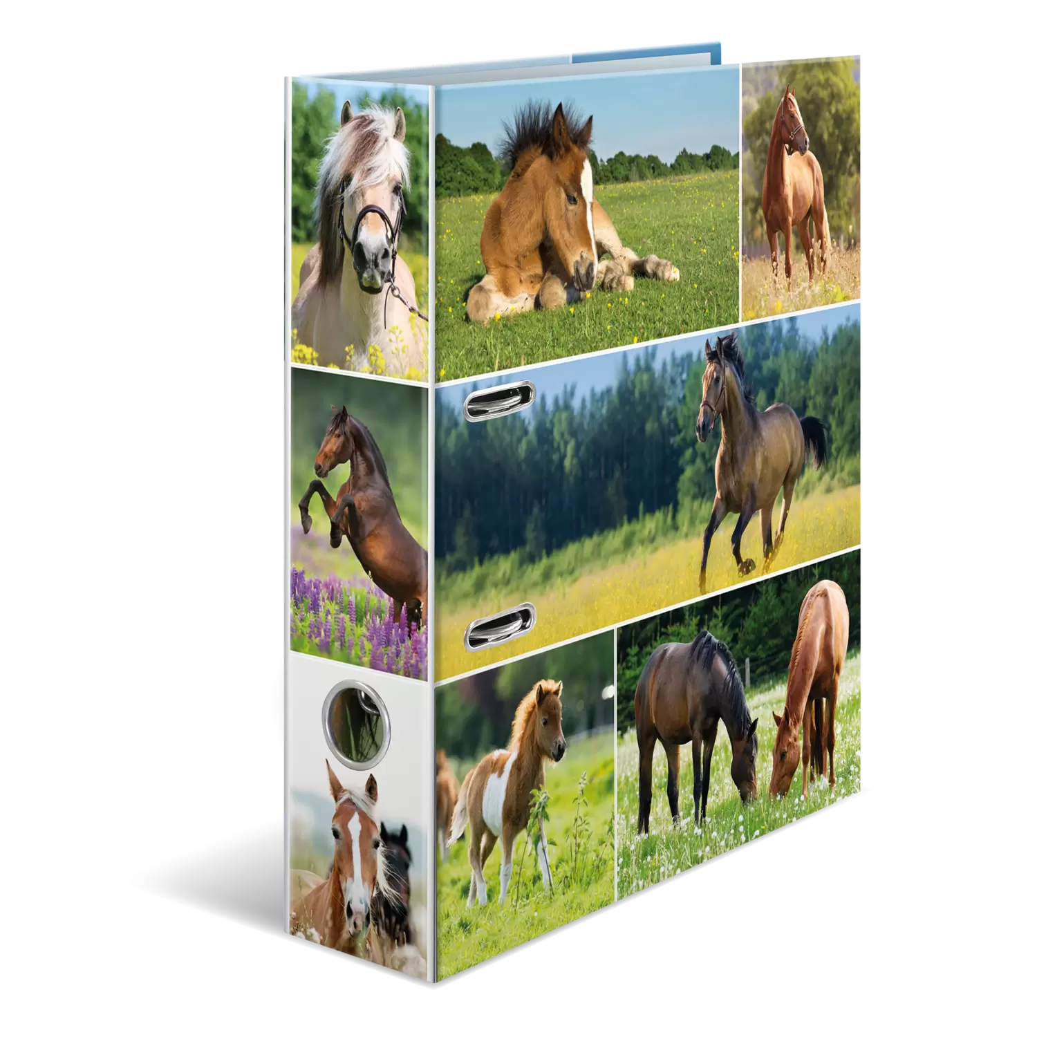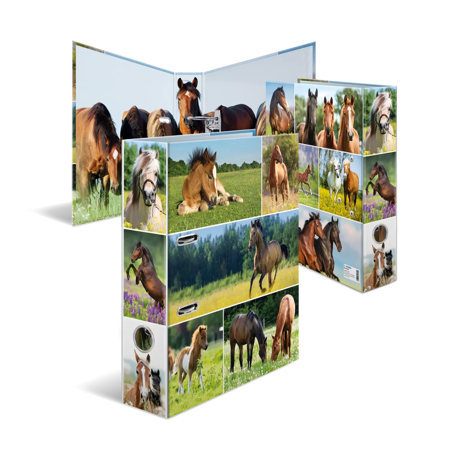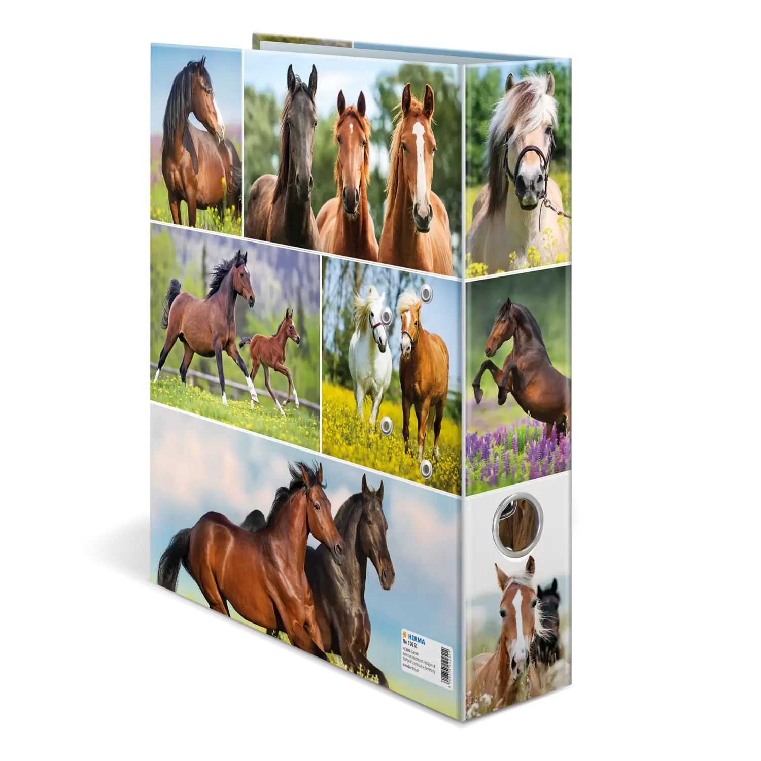 Paarden zijn fascinerende wezens, met hun kracht, snelheid en uithoudingsvermogen zijn zij al heel lang trouwe metgezellen van mensen en tot op de dag van vandaag is het enthousiasme en de liefde voor het dier ongebroken. Voor alle paardenliefhebbers, die hun paard het liefst mee naar huis zouden willen nemen, is deze DIN A4 thema-ordner met prachtige paarden- en ponyfoto's een absoluut highlight. De ordner is hoogwaardig gemaakt van stevig karton, met handig vingergat en hefboommechanisme (incl. klem), bedrukt aan de binnenzijde, voor het optimaal opbergen van geperforeerde documenten en transparante hoezen. Voor optimale orde thuis, op school, universiteit of op kantoor en tegelijkertijd een echte blikvanger.