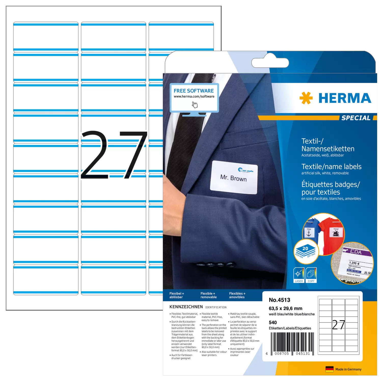 Naam/textieletiketten, verwijderbaar, A4, 63,5 x 29,6 mm, wit/blauw, van acetaatzijde, te bedrukken