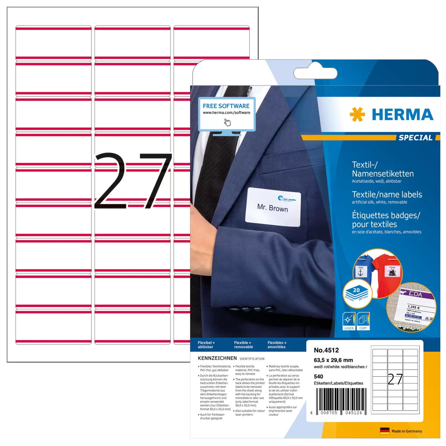 Etiketten van acetaatzijde, op A4-vellen, zelfklevend. Ideaal geschikt voor seminars, vergaderingen, beurzen of voor het labelen van stoffen, tapijten en matrassen. Praktisch alternatief voor plastic plaatjes: snel beschreven, perfect hechtend zonder speldje. Flexibel textielmateriaal, goed hechtend, goed verwijderbaar. Attentie: niet op fijn leer of fijne textiel, bijv. zijde, fluweel of corduroy plakken. Voor laserprinters, kopieerapparaten, kleurenlaserprinters en kleurenkopieerapparaten. Niet geschikt voor inkjetprinters. Gratis softwareoplossingen: www.herma.com/software