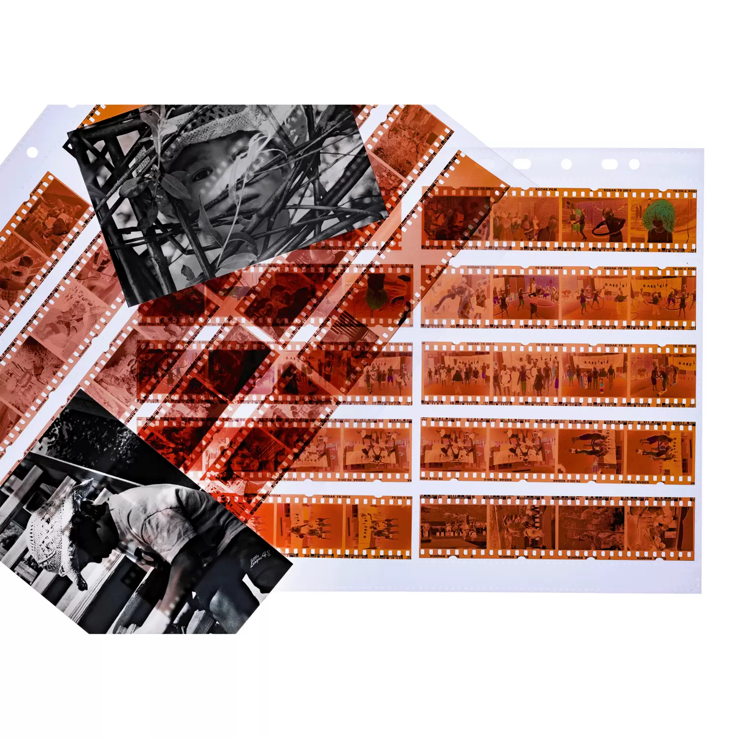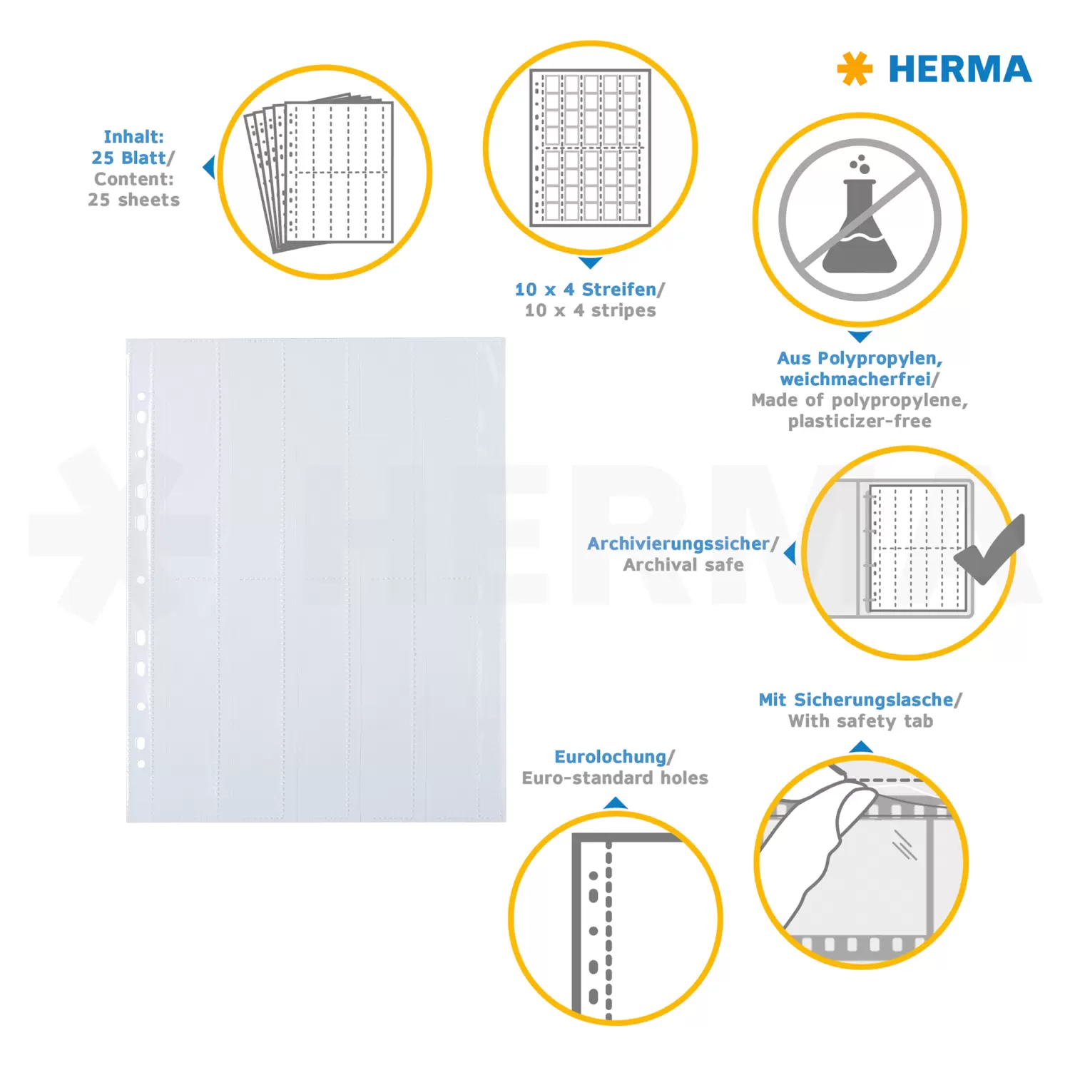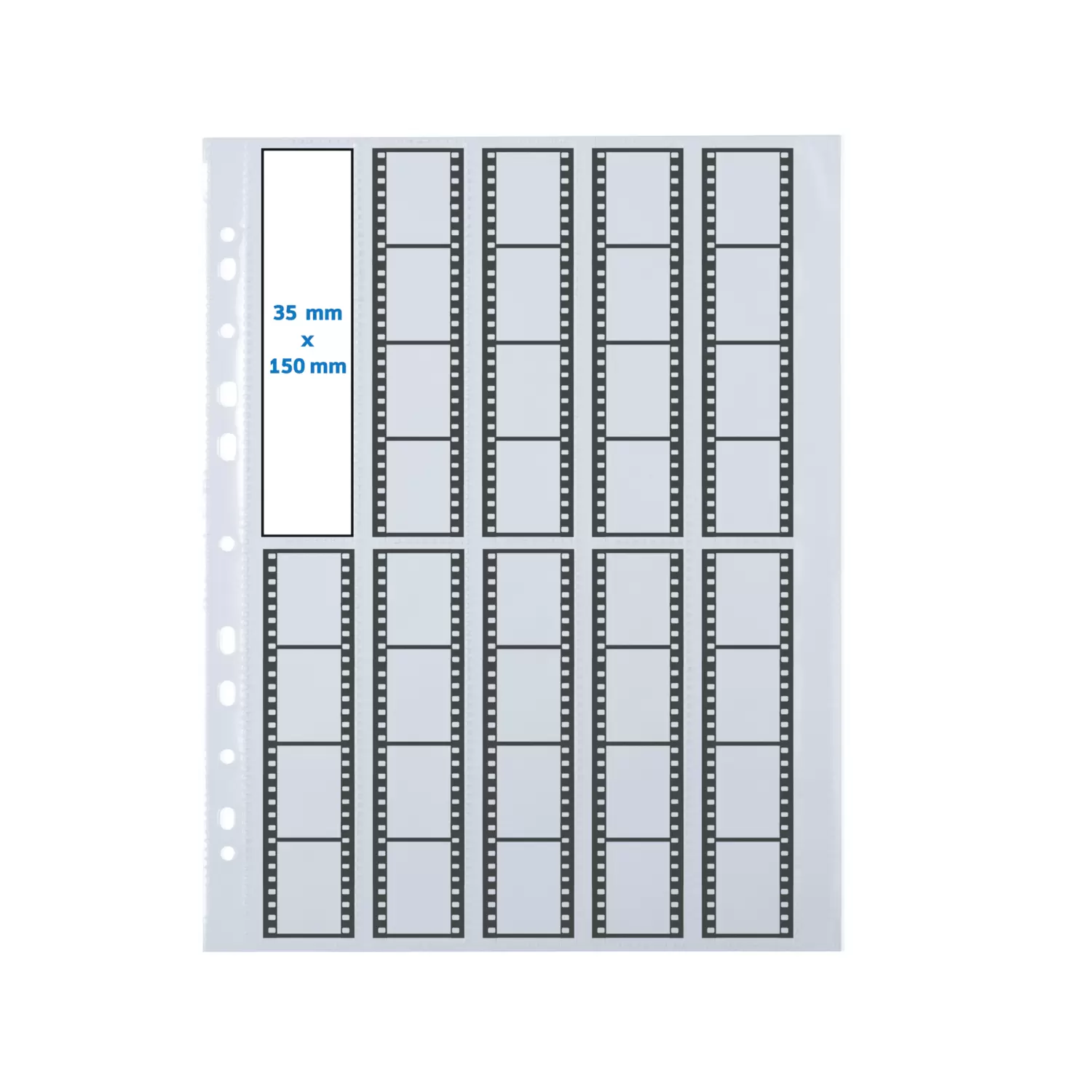 De Herma negatievenhoesjes voor kleinbeeldnegatieven zijn ideaal voor het netjes en overzichtelijk bewaren en archiveren van negatievenstrips. Ze zijn gemaakt van transparant, robuust en weekmakervrij polypropyleen en bieden per hoesje plek aan 10 strips à 4 foto's van het formaat 35 mm. Bijzonder eraan zijn de speciale beschermflapjes die voorkomen dat de negatieven uit de hoesjes kunnen vallen. Zo kunnen de negatieven er gemakkelijk worden ingestoken en uitgenomen en zijn desondanks optimaal beschermd. Een hoesje is ca. 24,5 x 31,5 cm groot en kan dankzij de europerforatie gemakkelijk in ordners, ringbanden of fotoboeken worden opgeborgen. Voor het optimaal vasthouden worden varianten met 4 ringen aanbevolen. Er zitten 25 hoesjes in een verpakking en dus is er voldoende plek voor max. 100 strips.