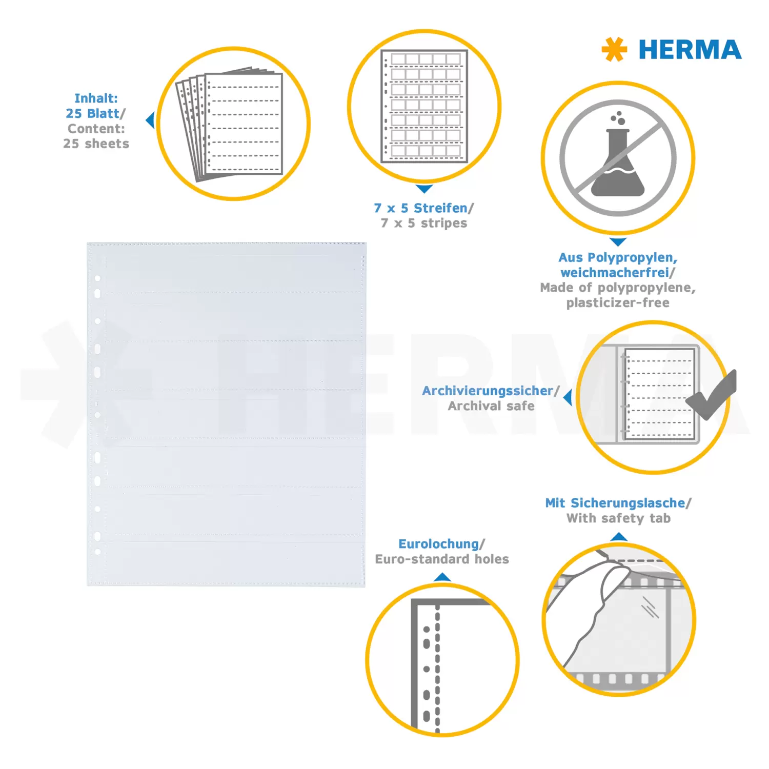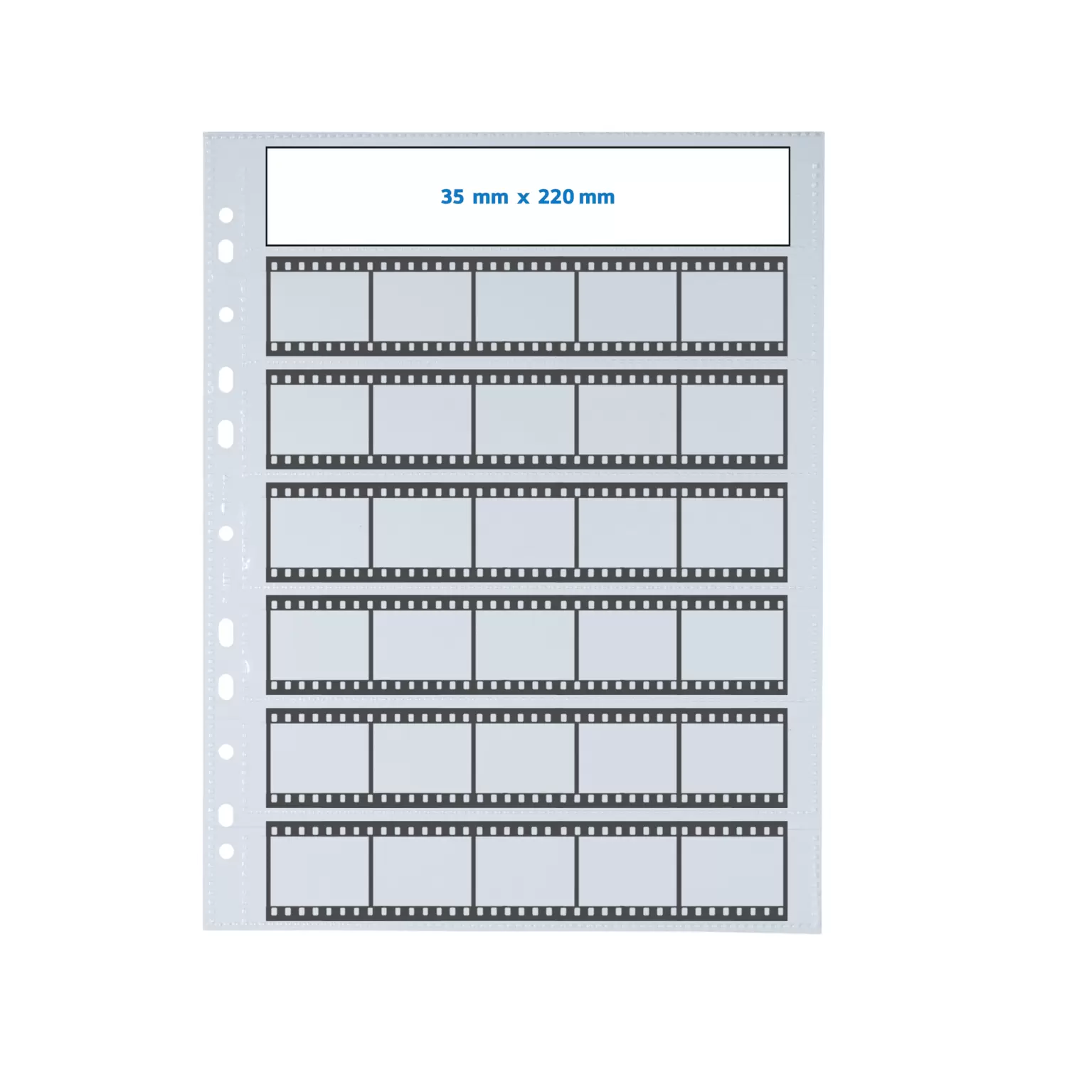 De Herma negatievenhoesjes voor kleinbeeldnegatieven zijn ideaal voor het netjes en overzichtelijk bewaren en archiveren van negatievenstrips. Ze zijn gemaakt van transparant, robuust en weekmakervrij polypropyleen en bieden per hoesje plek voor 7 strips à 5 foto's van het formaat 35 mm. Bijzonder eraan zijn de speciale beschermflapjes die voorkomen dat de negatieven uit de hoesjes kunnen vallen. Zo kunnen de negatieven er gemakkelijk worden ingestoken en uitgenomen en zijn desondanks optimaal beschermd. Een hoesje is ca. 24,3 x 29,7 cm groot en kan dankzij de europerforatie gemakkelijk in ordners, ringbanden of fotoboeken worden opgeborgen. Voor het optimaal vasthouden worden varianten met 4-rings systeem aanbevolen. Er zitten 25 hoesjes in een verpakking en dus is er voldoende plek voor max. 175 strips en 875 negatieven.