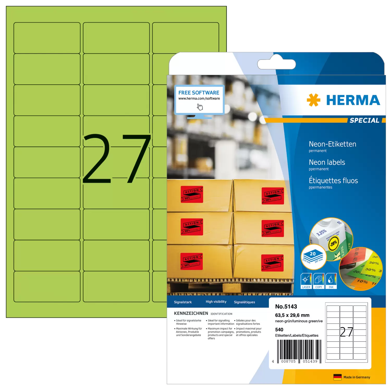 Etiketten in neonkleuren voor informatie met signaalfunctie, op A4-vellen, zelfklevend. Opvallend en informatief: ideaal voor het labelen met signaalfunctie, bijv. waarschuwingen, spoedaantekeningen, acties, kleurcoderingen. In 4 neonkleuren met sterke signaalfunctie, FSC® Mix Credit-gecertificeerd. Voor laser- en inkjetprinters, kopieerapparaten, kleurenlaserprinters en kleurenkopieerapparaten. Storingvrije verwerking dankzij veiligheidsrand rondom en optimale vlakligging. Gratis softwareoplossingen: www.herma.com/software.