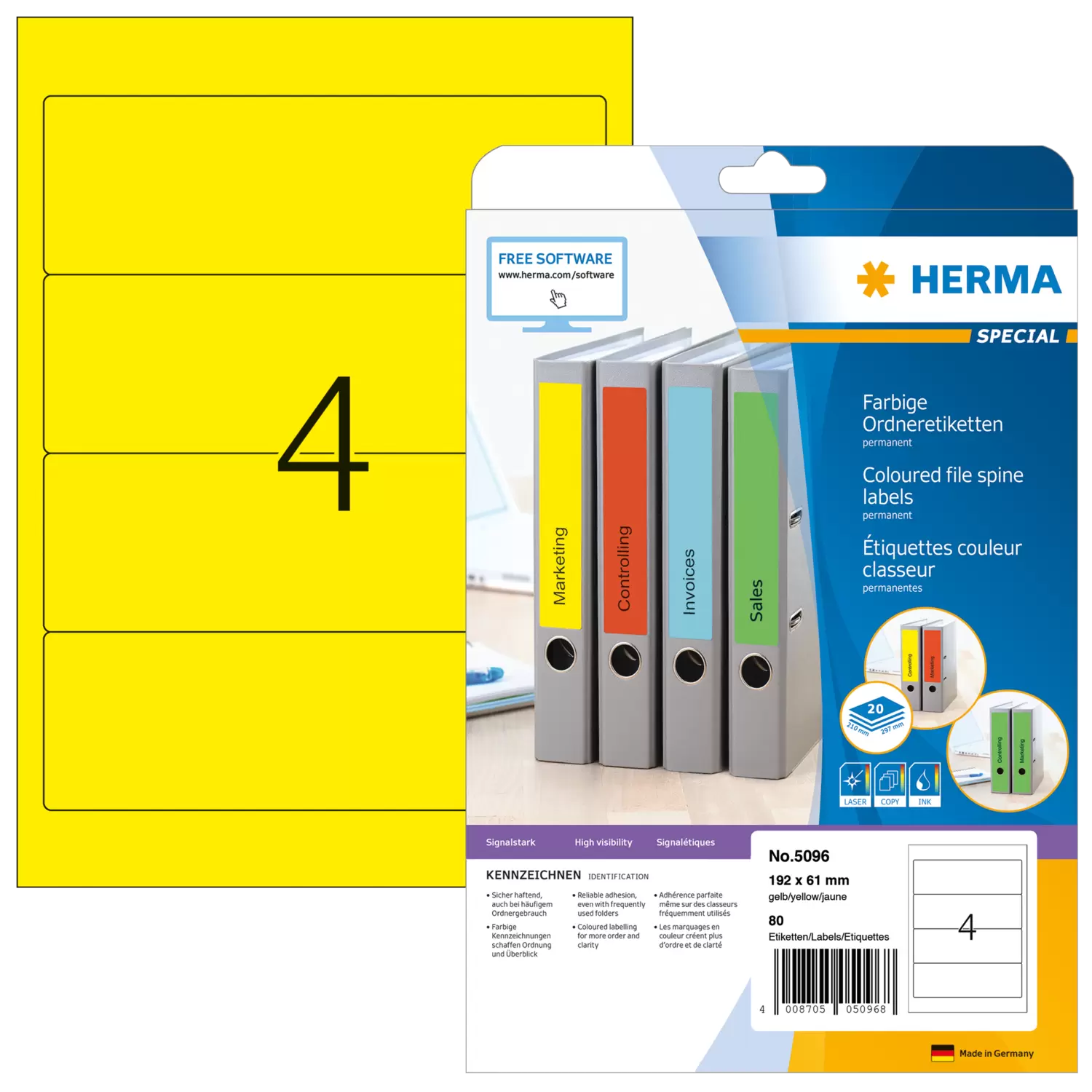 Ordneretiketten, A4, 192 x 61 mm, geel, permanent hechtend