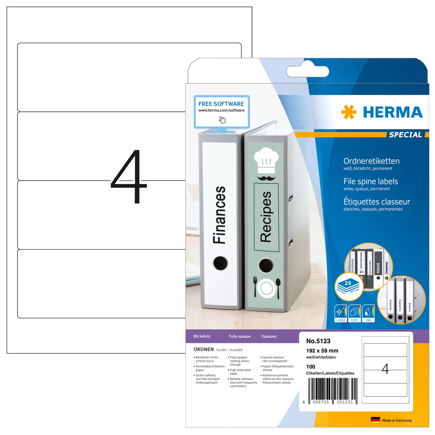 Ordneretiketten, A4, 192 x 59 mm, wit, ondoorzichtig, permanent hechtend