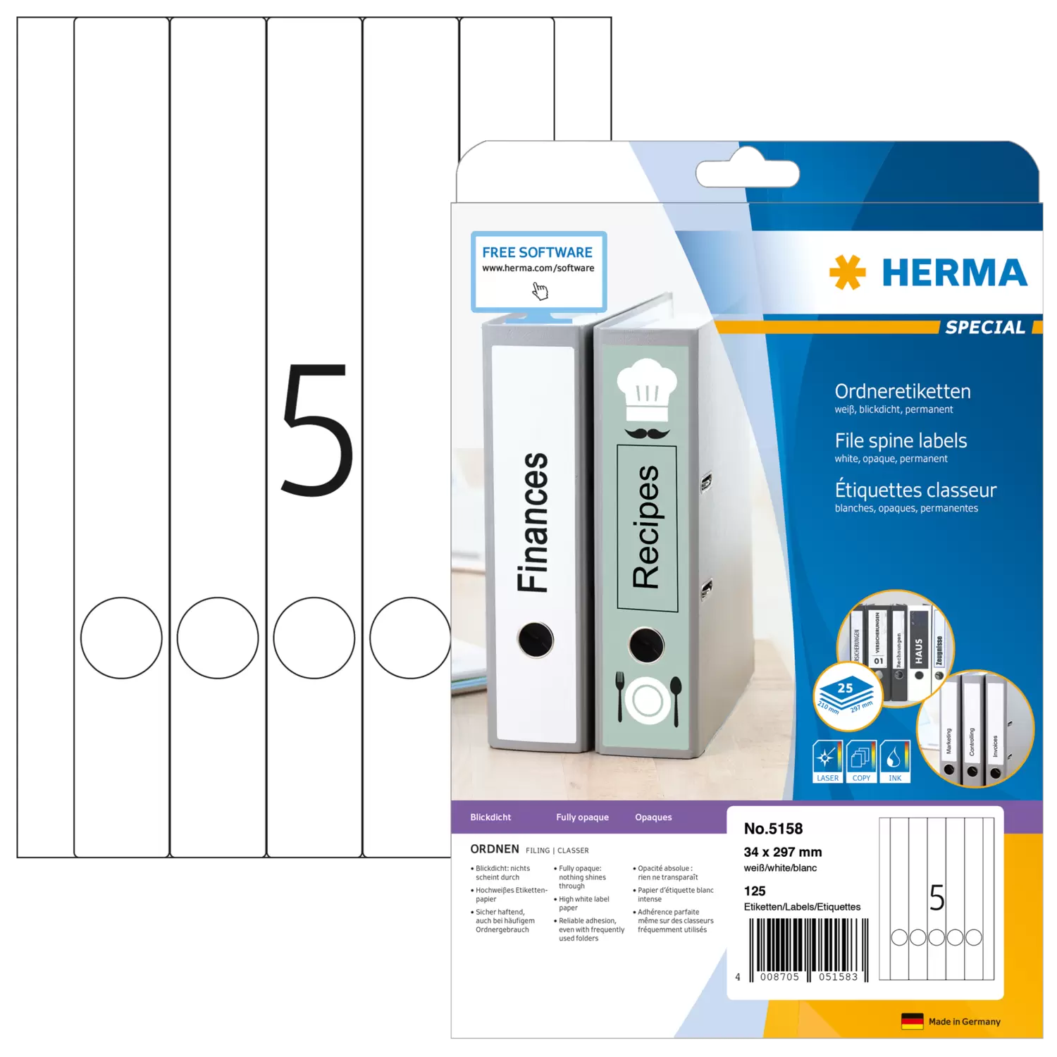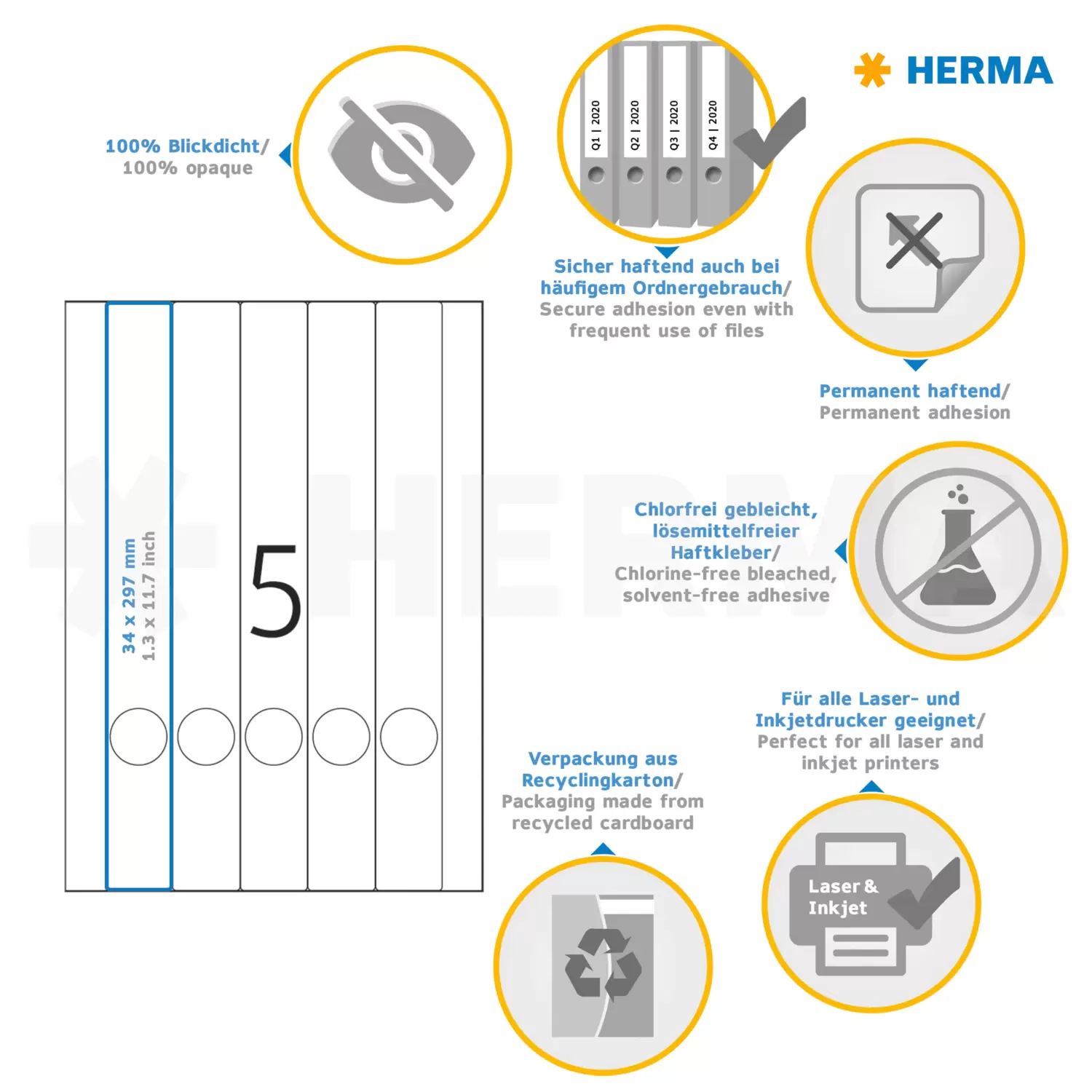 Ordneretiketten, op A4-vellen, zelfklevend. Voor een uniform uiterlijk op kantoor en thuis. Geschikt voor alle gangbare ordners. Absoluut ondoorzichtig materiaal met een hoge witheidsgraad, oude ordneropschriften schijnen niet door. Blanco: ideaal voor bedrijfslogo, opschriften en ordneraantekeningen. Goed hechtend ook bij veelvuldig gebruik van de ordner. Milieuvriendelijk: hoogwaardig, chloorvrij gebleekt speciaal papier, FSC® Mix Credit-gecertificeerd, oplosmiddelvrije contactlijm. Etiketten zijn 100 % recyclebaar met het oud papier, verpakking van gerecycled karton. Zeer goede drukresultaten op alle laser- en inkjetprinters, kopieerapparaten, kleurenlaserprinters en kleurenkopieerapparaten. Storingvrije verwerking dankzij veiligheidsrand rondom en optimale vlakligging. Gratis softwareoplossingen: www.herma.com/software.