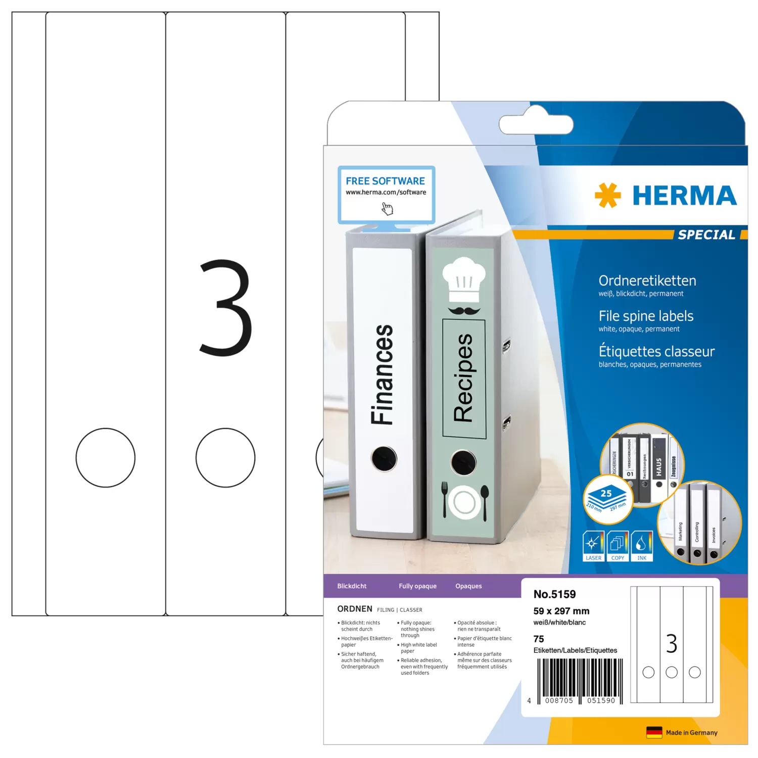 Ordneretiketten, op A4-vellen, zelfklevend. Voor een uniform uiterlijk op kantoor en thuis. Geschikt voor alle gangbare ordners. Absoluut ondoorzichtig materiaal met een hoge witheidsgraad, oude ordneropschriften schijnen niet door. Blanco: ideaal voor bedrijfslogo, opschriften en ordneraantekeningen. Goed hechtend ook bij veelvuldig gebruik van de ordner. Milieuvriendelijk: hoogwaardig, chloorvrij gebleekt speciaal papier, FSC® Mix Credit-gecertificeerd, oplosmiddelvrije contactlijm. Etiketten zijn 100 % recyclebaar met het oud papier, verpakking van gerecycled karton. Zeer goede drukresultaten op alle laser- en inkjetprinters, kopieerapparaten, kleurenlaserprinters en kleurenkopieerapparaten. Storingvrije verwerking dankzij veiligheidsrand rondom en optimale vlakligging. Gratis softwareoplossingen: www.herma.com/software.