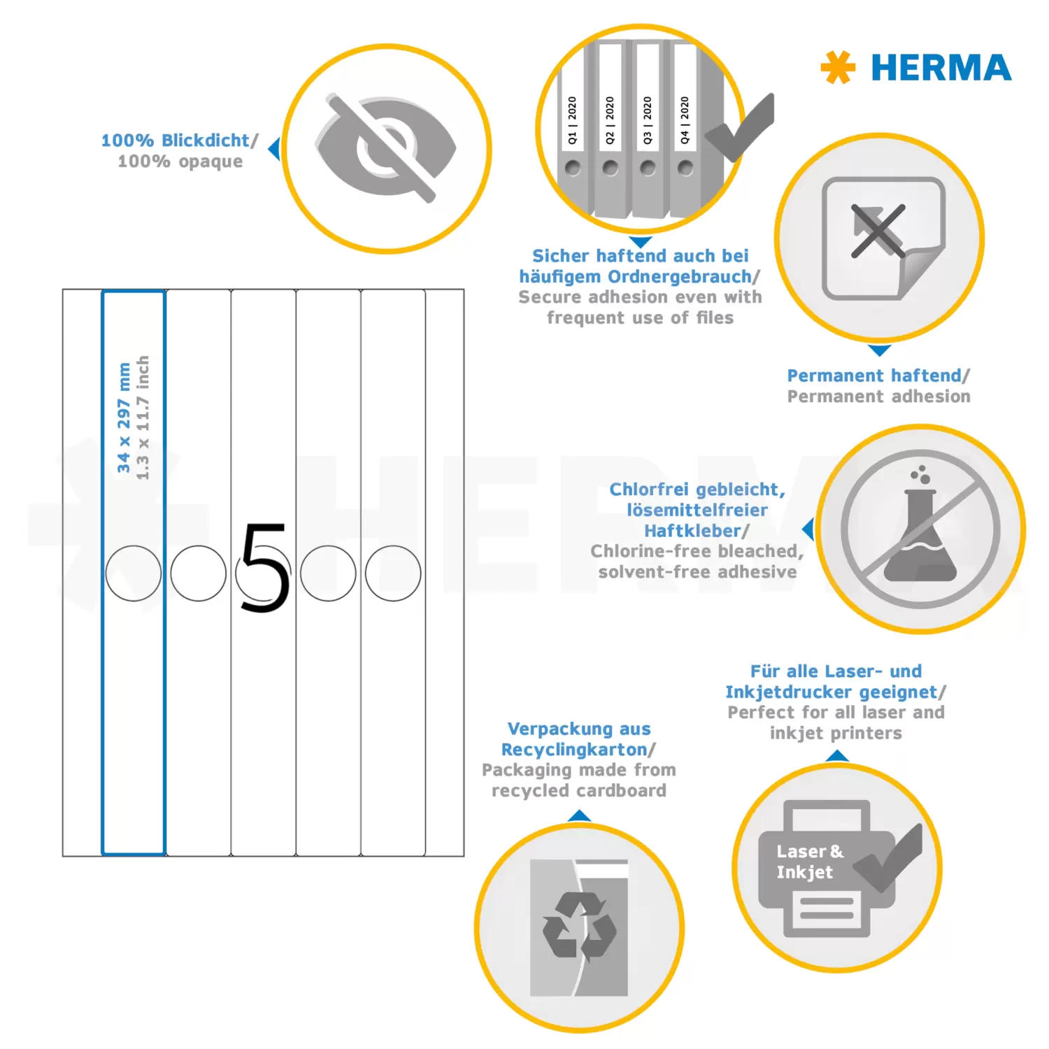 Hangordneretiketten, A4, 34 x 297 mm, wit, ondoorzichtig, permanent hechtend