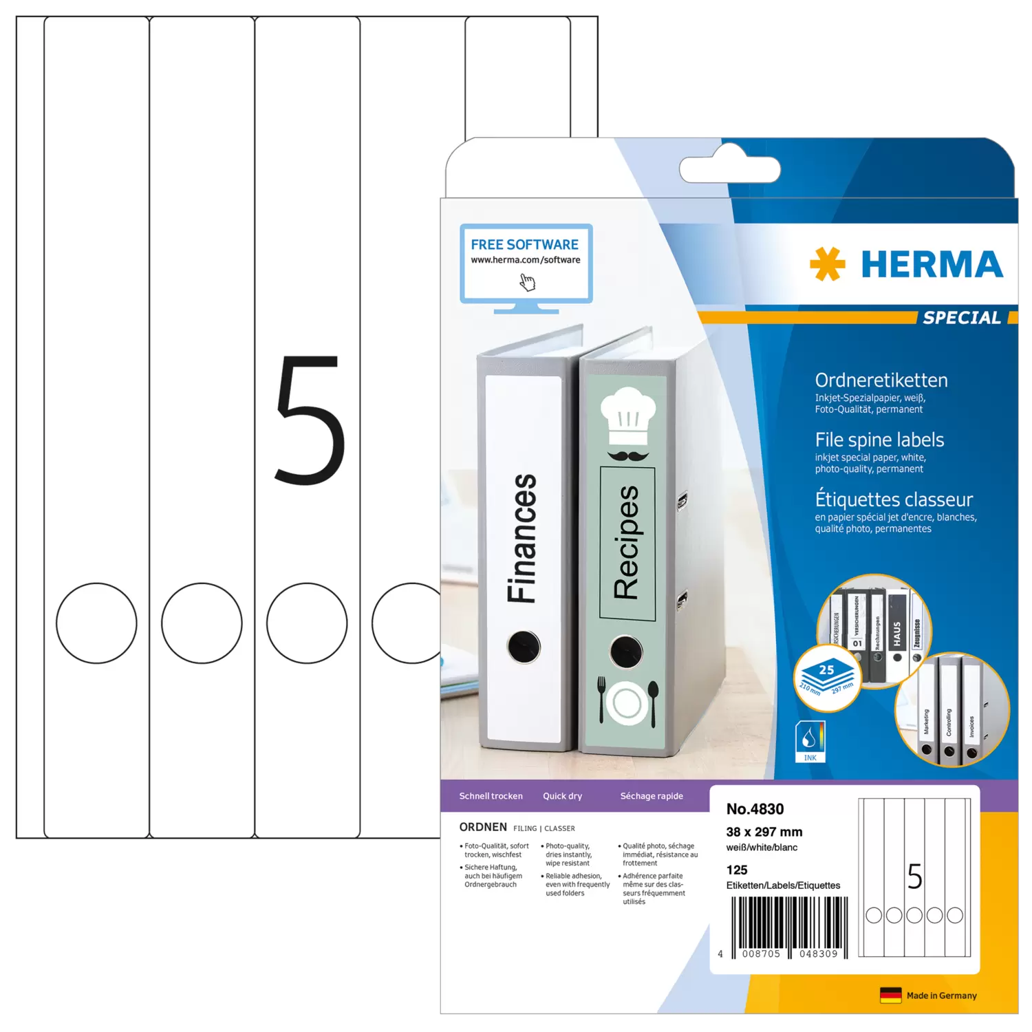 Inkjet-ordneretiketten, A4, 38 x 297 mm, wit, permanent hechtend