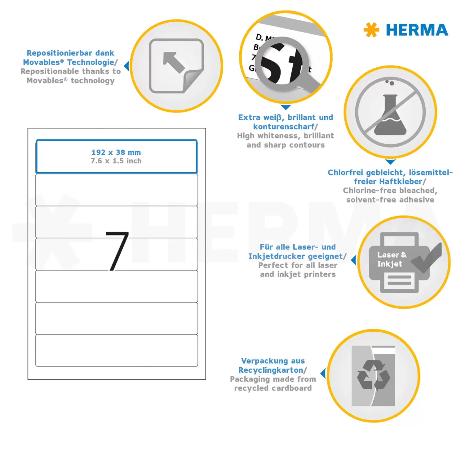 Verwijderbare ordneretiketten op A4-vellen. Goed hechtend, ook bij veelvuldig gebruik van de ordner, zonder achterblijvende resten weer te verwijderen zonder de ordner te beschadigen. Absoluut ondoorzichtig materiaal met een hoge witheidsgraad, oude ordneropschriften schijnen niet door. Blanco: ideaal voor bedrijfslogo, opschriften en ordneraantekeningen. Milieuvriendelijk: Milieuvriendelijk: FSC® Mix Credit-gecertificeerd, chloorvrij gebleekt, oplosmiddelvrije contactlijm. Etiketten zijn 100 % recyclebaar met het oud papier, verpakking van gerecycled karton. Zeer goede drukresultaten op alle laser- en inkjetprinters, kopieerapparaten, kleurenlaserprinters en kleurenkopieerapparaten. Storingvrije verwerking dankzij veiligheidsrand rondom en optimale vlakligging. Gratis softwareoplossingen: www.herma.com/software.
