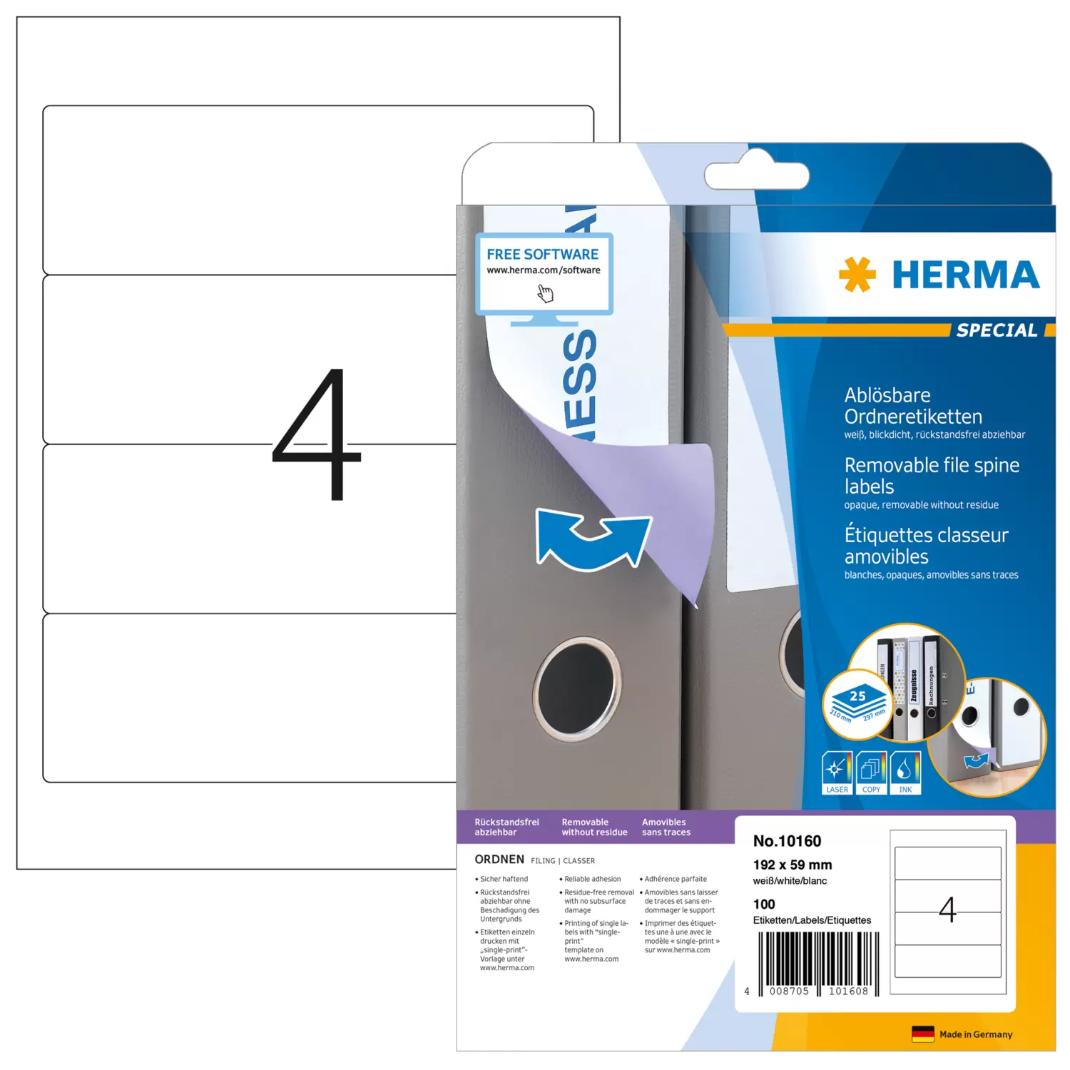 Verwijderbare ordneretiketten op A4-vellen. Goed hechtend, ook bij veelvuldig gebruik van de ordner, zonder achterblijvende resten weer te verwijderen zonder de ordner te beschadigen. Absoluut ondoorzichtig materiaal met een hoge witheidsgraad, oude ordneropschriften schijnen niet door. Blanco: ideaal voor bedrijfslogo, opschriften en ordneraantekeningen. Milieuvriendelijk: Milieuvriendelijk: FSC® Mix Credit-gecertificeerd, chloorvrij gebleekt, oplosmiddelvrije contactlijm. Etiketten zijn 100 % recyclebaar met het oud papier, verpakking van gerecycled karton. Zeer goede drukresultaten op alle laser- en inkjetprinters, kopieerapparaten, kleurenlaserprinters en kleurenkopieerapparaten. Storingvrije verwerking dankzij veiligheidsrand rondom en optimale vlakligging. Gratis softwareoplossingen: www.herma.com/software.