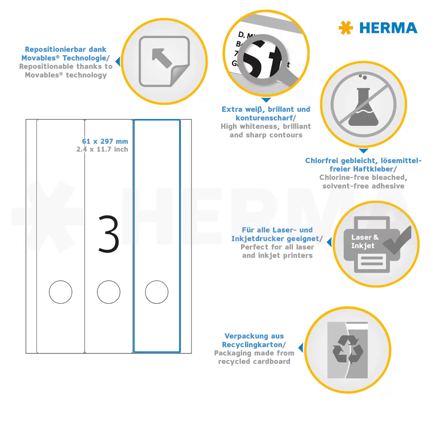 Verwijderbare ordneretiketten op A4-vellen. Goed hechtend, ook bij veelvuldig gebruik van de ordner, zonder achterblijvende resten weer te verwijderen zonder de ordner te beschadigen. Absoluut ondoorzichtig materiaal met een hoge witheidsgraad, oude ordneropschriften schijnen niet door. Blanco: ideaal voor bedrijfslogo, opschriften en ordneraantekeningen. Milieuvriendelijk: Milieuvriendelijk: FSC® Mix Credit-gecertificeerd, chloorvrij gebleekt, oplosmiddelvrije contactlijm. Etiketten zijn 100 % recyclebaar met het oud papier, verpakking van gerecycled karton. Zeer goede drukresultaten op alle laser- en inkjetprinters, kopieerapparaten, kleurenlaserprinters en kleurenkopieerapparaten. Storingvrije verwerking dankzij veiligheidsrand rondom en optimale vlakligging. Gratis softwareoplossingen: www.herma.com/software.