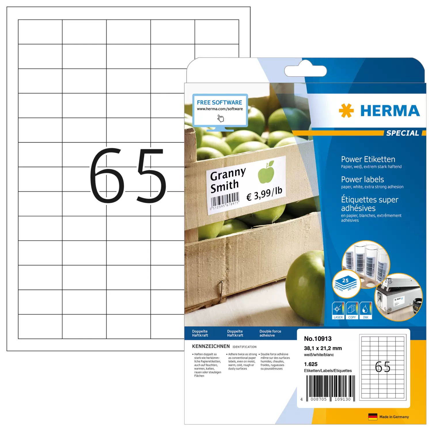 Extreem sterk hechtende etiketten op A4-vellen, zelfklevend. Hechten dubbel zo sterk als traditionele papieren etiketten, ook op een kritische ondergrond, bijv. vochtige, warme, koude, ruwe of stoffige oppervlakken. Ideaal voor het effectief labelen van producten, documenten en inventaris, voor veiligheidsrichtlijnen en waarschuwingen, voor rondom plakken, als keuringsetiket of als sluitetiket, voor binnen. Milieuvriendelijk: hoogwaardig, chloorvrij gebleekt speciaal papier, FSC® Mix Credit-gecertificeerd, oplosmiddelvrije contactlijm. Etiketten zijn 100 % recyclebaar via het oud papier, verpakking van gerecycled karton. Zeer goede drukresultaten op alle laser- en inkjetprinters, kopieerapparaten, kleurenlaserprinters en kleurenkopieerapparaten. Storingvrije verwerking dankzij veiligheidsrand rondom en optimale vlakligging. Gratis softwareoplossingen: www.herma.com/software.