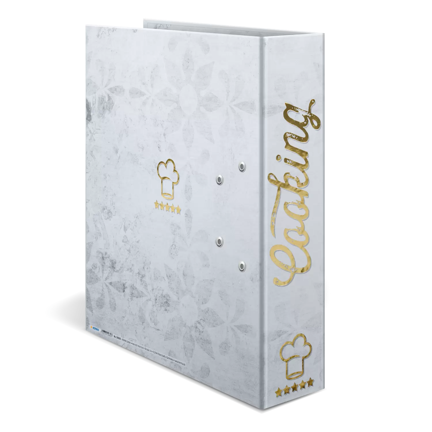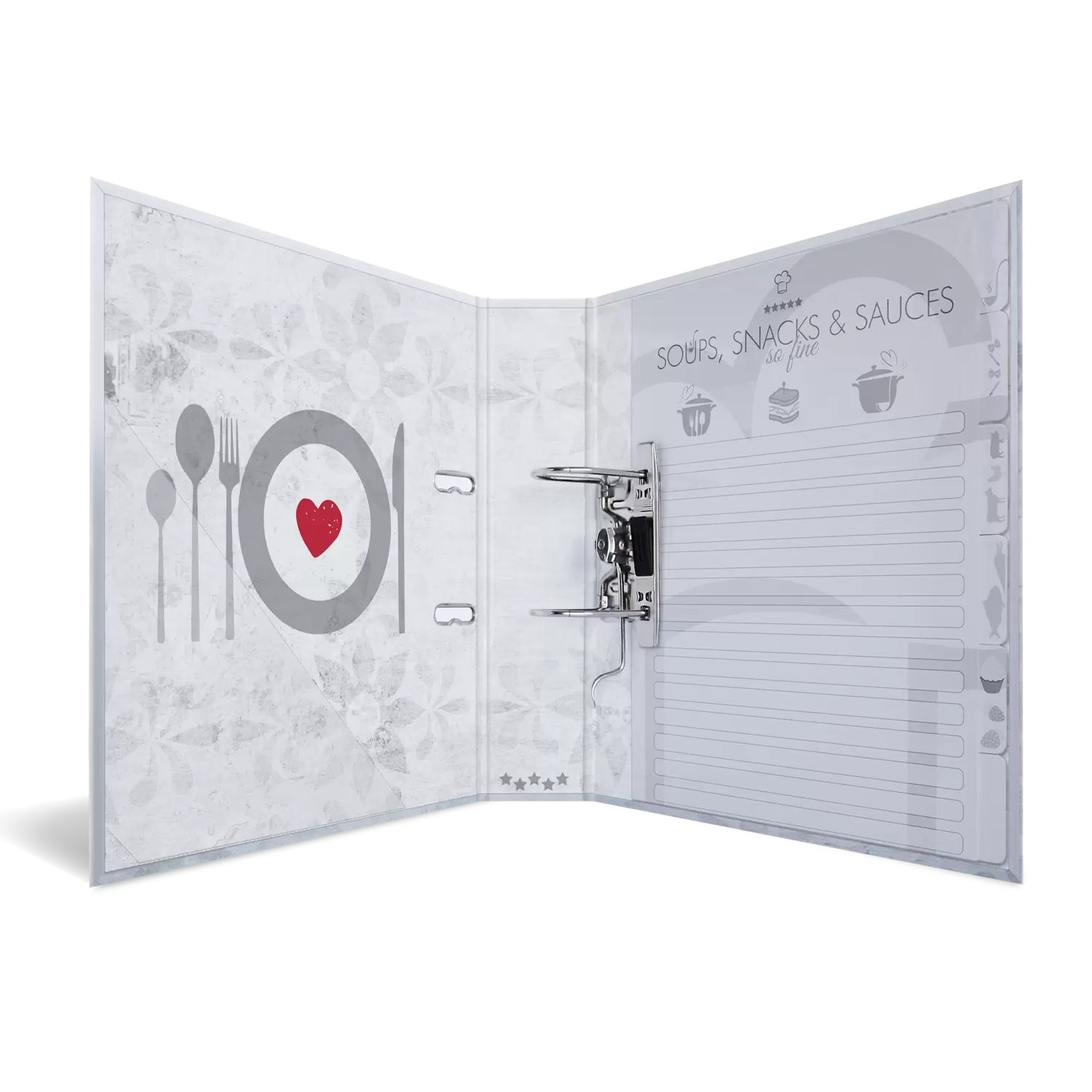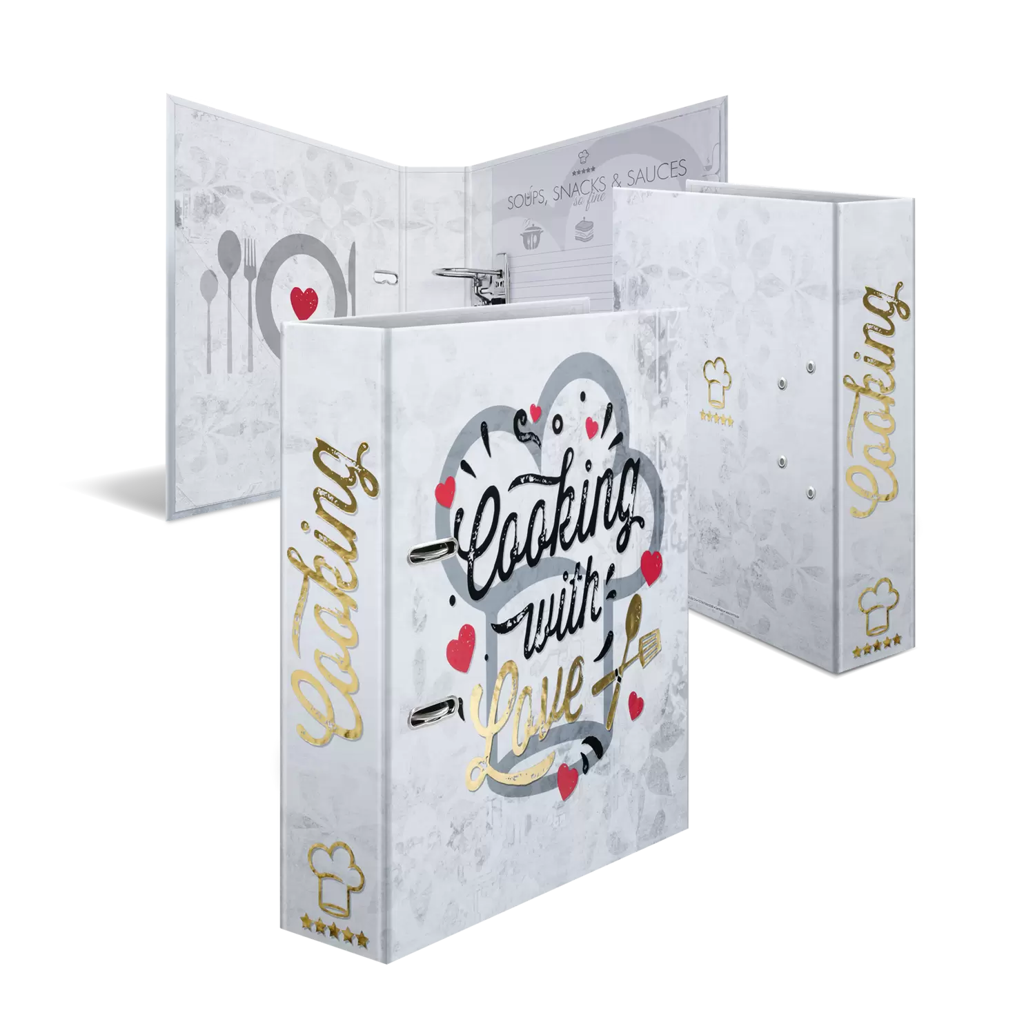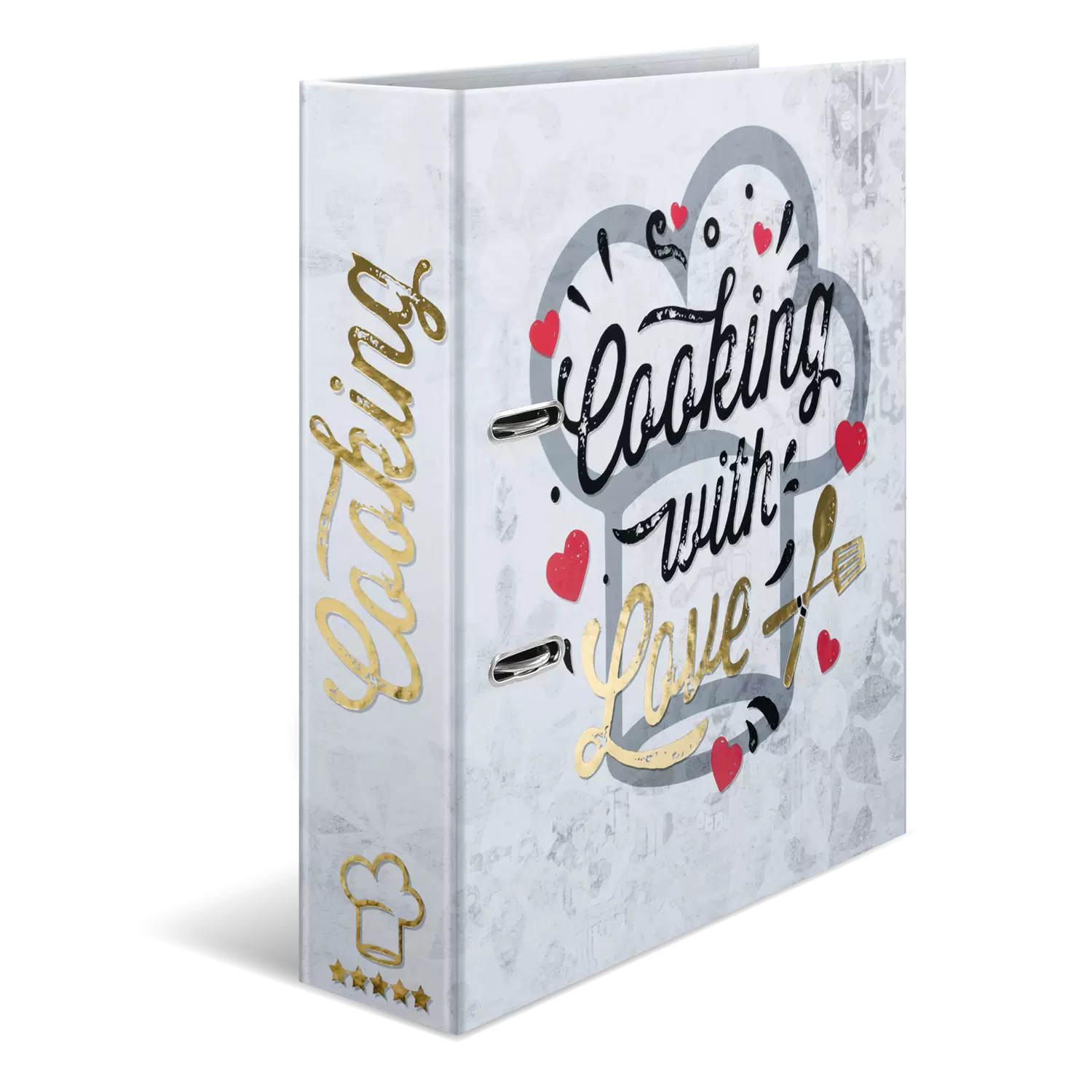 De HERMA thema-map "Cooking with Love" in A4-formaat biedt veel plaats voor al je favoriete bak- en kookrecepten en is geschikt voor alle transparante hoesjes met standaardperforatie. Zo blijven recepten goed beschermd tegen spatten en vingerafdrukken. Met de praktische 6-delige index kunnen recepten, ideeën, tips en trucs gemakkelijk worden gecategoriseerd en teruggevonden. De index is onderverdeeld in "Soups, Snacks & Sauces", "Pasta <(><<)>(><(>&<)><(><<)>)> Co.", "Meat", "Veggies <(><<)>(>&<(><<)>)> Seafood", "Dessert" en een lege pagina om zelf te beschrijven. Ideaal voor iedereen die graag kookt, nieuwe dingen in de keuken uitprobeert of gewoon een beetje wil experimenteren. De decoratieve ordner in een fris design is gemaakt van stevig karton, heeft een hoogwaardig hefboommechaniek met klem en is afgewerkt met goudfolie – een echte blikvanger op de keukenplank. Bijzonder clever: het opgelijmde steekvakje aan de binnenkant voor belangrijke notities en meer.