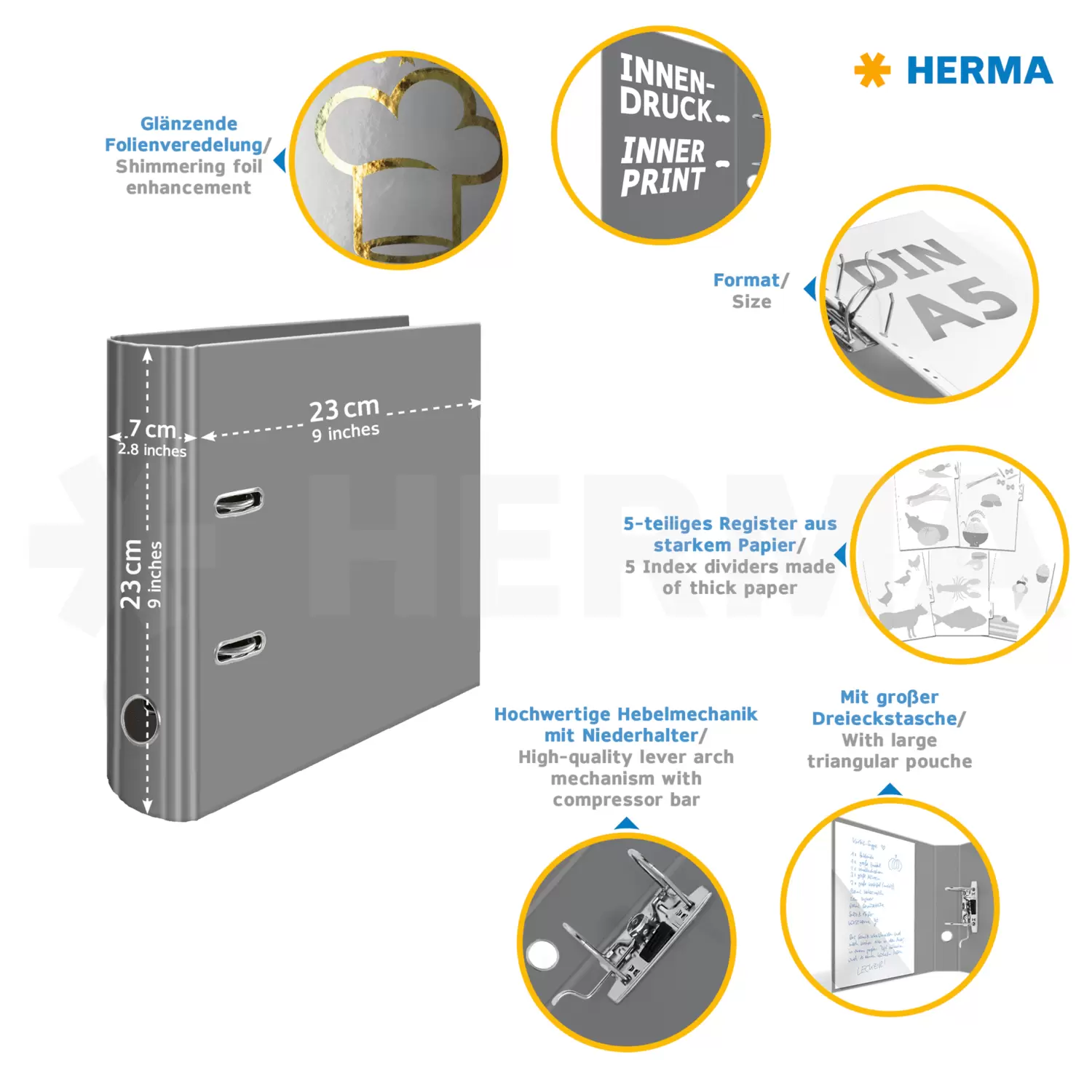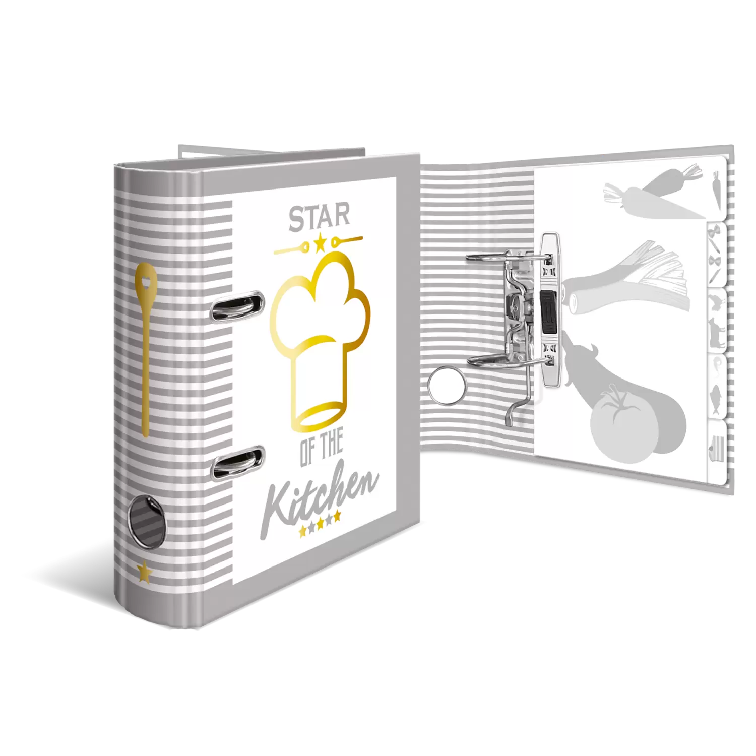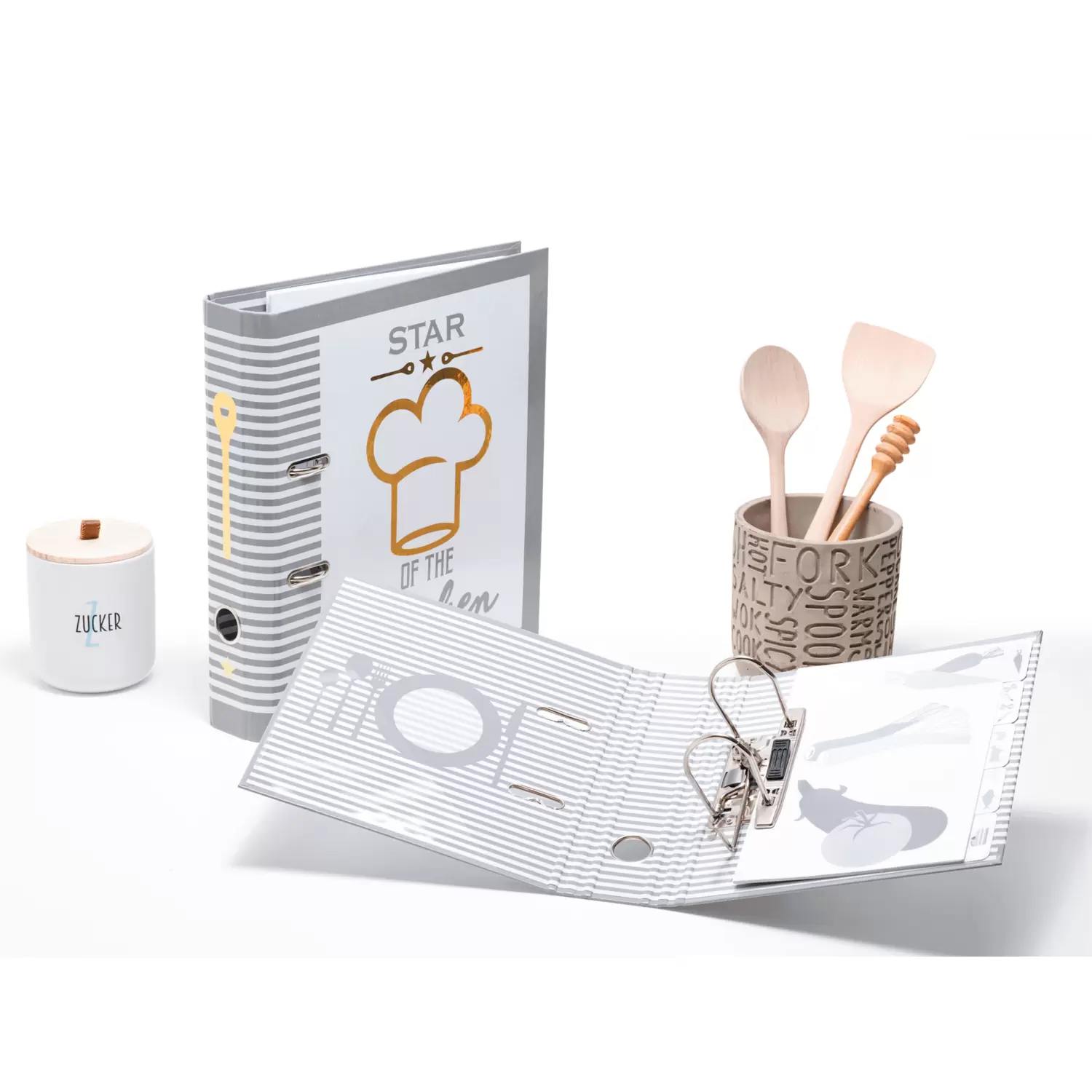 Nobele, decoratieve receptenordner met goud folie-preegdruk, gebogen rug en grip gat. Ideaal voor alle favoriete recepten. Inclusief 5-delig register met fijn geïllustreerde onderwerpen groenten, vlees, vis, bijgerechten en dessert. Een must-have voor alle keuken sterren en amateurkoks.
