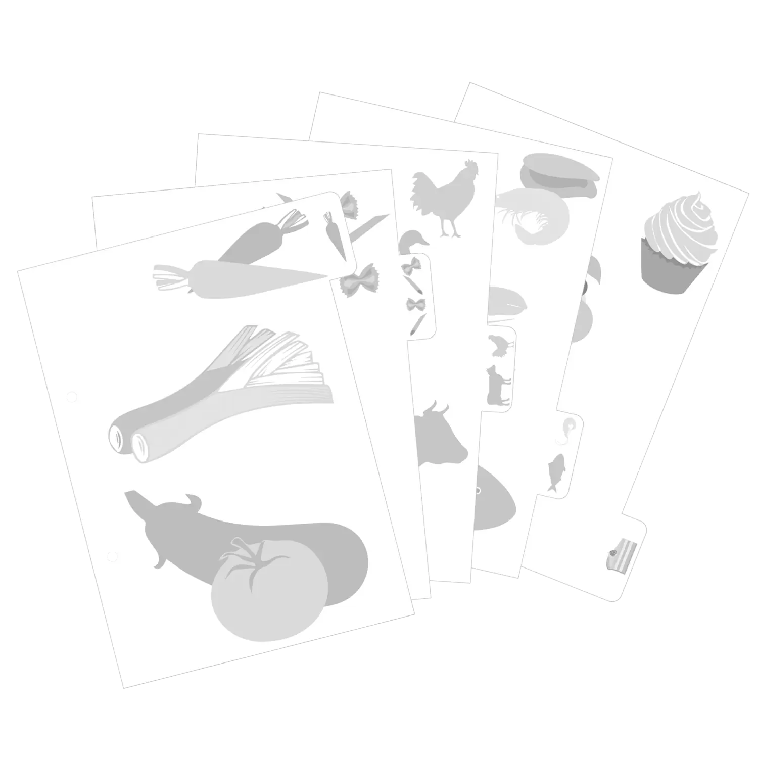 • Inclusief 5-delig register met fijn geïllustreerde onderwerpen (groente, vlees, vis, bijgerechten en dessert)