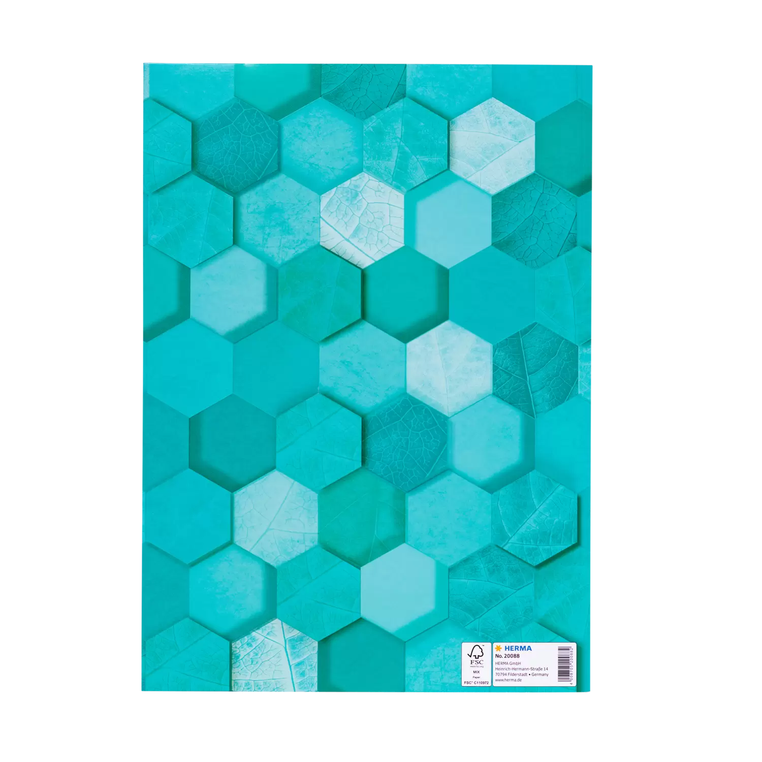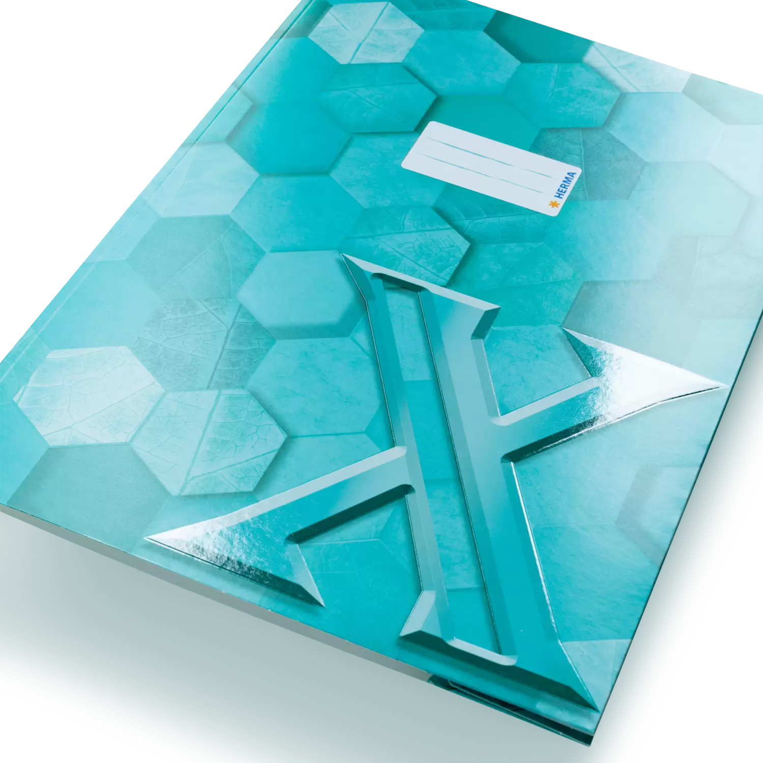 De HERMA kaft X van robuust karton is uniek en mysterieus. Staat de fraai gestileerde X aan de voorkant voor de variabele in de wiskunde, als code voor een geheim, voor het creatieve element, of als onbekende voor de inhoud van het te beschermen schrift of boekje? De kaft van de serie X is niet alleen maar een simpele beschermhoes, maar ook de toegang tot een wereld vol avonturen en geheimen, mystiek en divers. Deze turquoise kaft X heeft het formaat DIN A4 en is versierd met kunstige hexagonen, die gevuld zijn met fijne bladstructuren en zo een fascinerende organische structuur creëren. De uitstraling van het coole design met de fraai gestileerde X ontketent je creativiteit en helpt je gedachten spelenderwijs op papier te zetten. Of het nu op school is, tijdens de studie of in de vrije tijd – deze kaft is de perfecte uitkomst voor iedereen die op zoek is naar iets bijzonders: De nieuwe serie X.