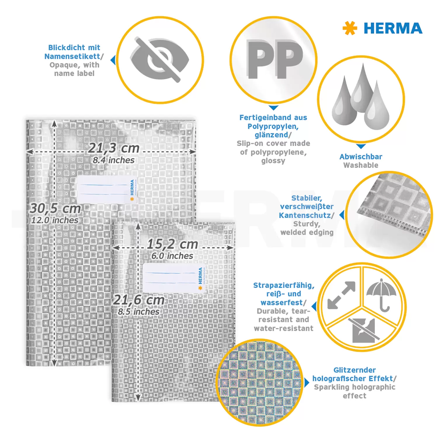 Deze glinsterende A5-schriftkaft van HERMA is een echte blikvanger: dankzij de opvallende, holografische glansfolie krijgt de zilverkleurige beschermhoes in het licht een heel bijzondere eigenschap. Valt er licht op de omslag, dan betovert hij door bonte regenboogkleuren die prachtig glinsteren en glitteren. Het fijne patroon dat op de folie is geprint, komt daardoor nog beter uit. De beschermkaft van HERMA onderscheidt zich behalve door het buitengewone design ook door de praktische functionaliteit. Het robuuste materiaal polypropyleen is een sterke kunststof die alle documentatiemateriaal, rekenboekjes, schrijf- en andere schoolschriften in DIN A5-formaat veilig beschermd tegen bijvoorbeeld stof en vlekken en tegen beschadiging door langdurig gebruik. Bovendien wordt het risico van vervelende ezelsoren aan de hoeken geminimaliseerd, waardoor schriften en boekjes er langer 'als nieuw' uitzien. Daarnaast beschikt de beschermkaft over een aan de voorkant aangebracht etiket, waarop nuttige informatie kan worden geschreven. Hierop schrijft de eigenaar van het schrift op welke school of in welke klas hij of zij zit of andere, individuele gegevens. Deze schriftomslag geeft aan het leven van alledag een vleugje magie en zorgt tegelijkertijd voor nette schriften die lang meegaan.