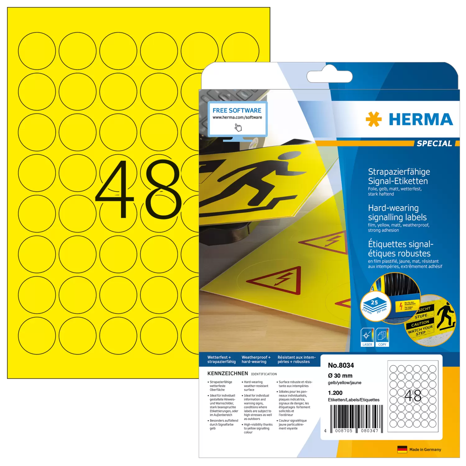 Gele folie-etiketten op A4-vellen, zelfklevend. Ideaal voor etiketten op zwaar belaste plaatsen en buiten: eigendomsetiketten, etalagestickers, attentie- en waarschuwingsplaatjes, labelen in het magazijn en in de productie. Bijzonder opvallend dankzij de signaalkleur geel. Slijt- en weervast oppervlak, zeer sterk hechtend, verouderingsbestendig, olie en vuil afstotend, afwasbaar, temperatuurbestendig van -30 tot 80 °C, zeewaterbestendig. Storingvrije verwerking dankzij veiligheidsrand rondom en optimale vlakligging. Voor laserprinters en kopieerapparaten, kleurenlaserprinters en kleurenkopieerapparaten. Niet geschikt voor inkjetprinters. Gratis softwareoplossingen: www.herma.com/software.