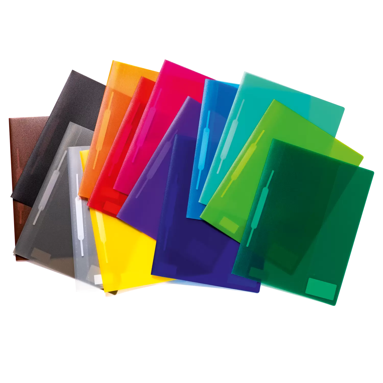 • Snelhechters voor A4 van milieuvriendelijk, sterk doorschijnend polypropyleen-folie met metalen klem, in 14 kleuren, met opschriftetiket en steekvak