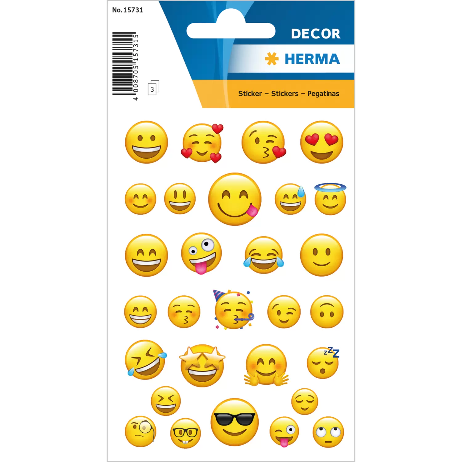 Iedereen kent ze en velen gebruiken ze: emoji's, de kleine gele gezichtjes die alle mogelijke emoties weergeven. Lachen, huilen, slapen, cool, blij of gek zijn, een knipoog of een kusje sturen, met een van de 29 stickers komt de boodschap over. De stickers zijn gemaakt van hoogwaardig papier, permanent hechtend en zelfklevend op nagenoeg alle oppervlakken. Elke verpakking bevat 3 stickervellen met elk 29 verschillende emoticons. Ze kunnen er heel gemakkelijk van worden verwijderd en naar believen opnieuw worden opgeplakt. Ideaal als versiering voor schriften, ordners en mappen, om te knutselen of voor sparen en ruilen.