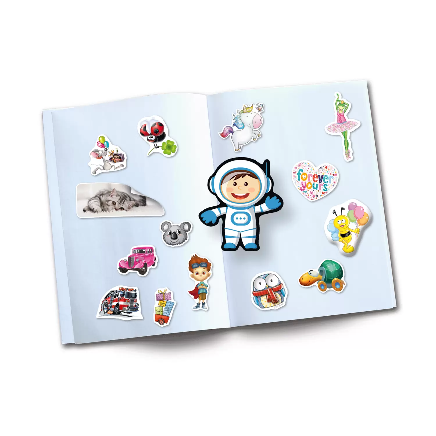 • 16 blanco blaadjes met een siliconencoating voor het inplakken en weer verwijderen van stickers en plakplaatjes