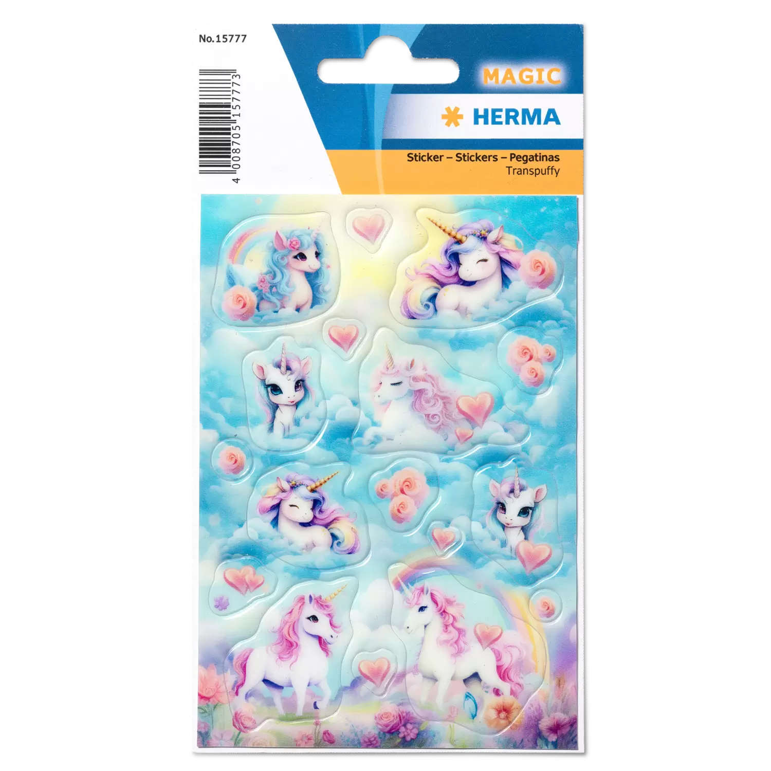 De „Happy Unicorns“ stickers toveren en feeërieke wereld vol magie direct in de handen van kleine eenhoorn-fans. Elke verpakking bevat prachtig mooie rozen en hartenstickers en stickers van eenhoorns, die je met hun grote, stralende ogen betoveren. Omgeven door donzige wolken creëren deze stickers een sprookjesachtig decor, dat de fantasie prikkelt. Gemaakt van hoogwaardig Transpuffy-materiaal geven ze er een uniek 3D-effect aan. Ideaal voor prinsesjes en prinsjes die hun creatieve stickerspelletjes graag met een vleugje magie willen betoveren. De „Happy Unicorns“ stickers zijn perfect om te versieren, verzamelen of cadeau te doen en geven een beetje extra glans aan het leven van alledag - een kleurrijk avontuur voor alle eenhoorn-fans!