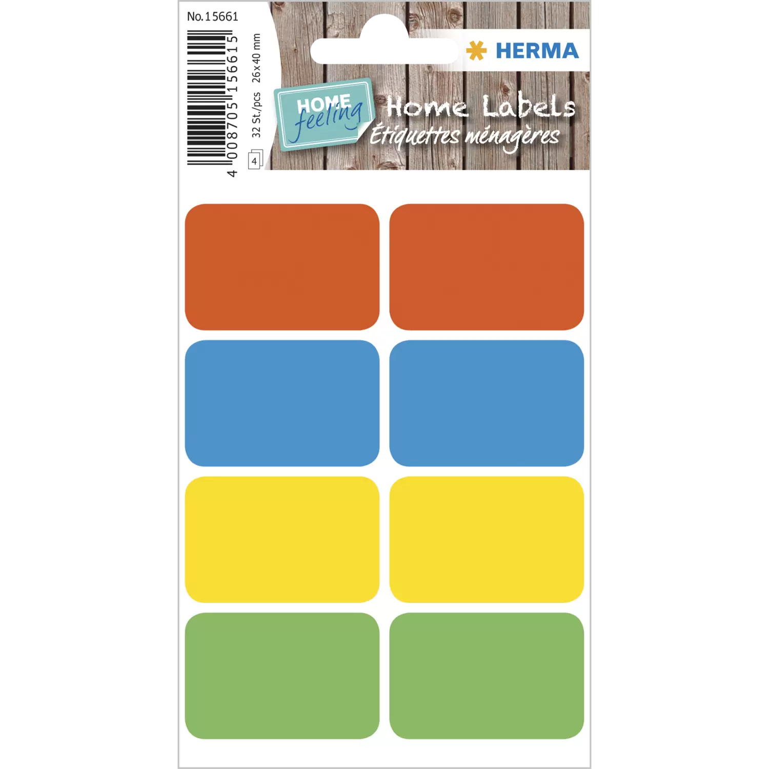 De kleine hulpjes die helpen orde te houden in het huishouden: Van wie is dat? Waar hoort wat thuis? Wat zit daarin? Etiketteren en markeren helpt bij de strijd tegen de dagelijkse chaos in de huishouding, spaart je zenuwen bij het terugvinden van dingen en verfraait bovendien het huis. De praktische zelfklevende etiketten om zelf te beschrijven van HERMA HOME in de kleine handzame verpakking horen thuis in elke rommellade. Zo kunnen kruiden, tupperwarebakjes, voorraden en benodigdheden in de keuken, gereedschappen, dozen, kratten en stellingkasten in de kelder, lades en nog veel meer eenvoudig en overzichtelijk in het hele huis worden geëtiketteerd Elke verpakking bevat 32 permanent hechtende etiketten, telkens 8 van de kleuren rood, blauw, geel en groen, in het formaat 26 x 40 mm. Het oppervlak is fijn mat en kan met viltstiften en balpennen uitstekend worden beschreven zonder uit te lopen. De afgeronde hoeken maken het gemakkelijk om de etiketten van het rugpapier te halen en ze naar believen op te plakken. Let op: de etiketten zijn niet geschikt voor het gebruik in printers.