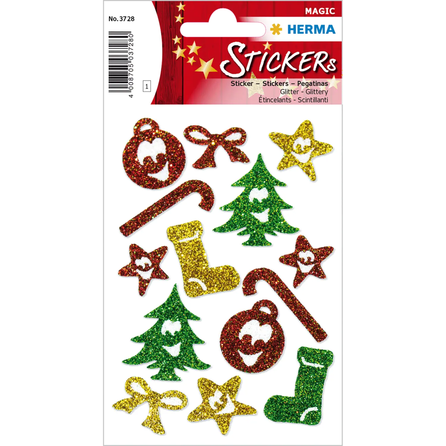 Zelfklevende decoratieve etiketten van speciale materialen, bont bedrukt met Kerstmotieven. Voor het decoreren van geschenken, kaarten en brieven.