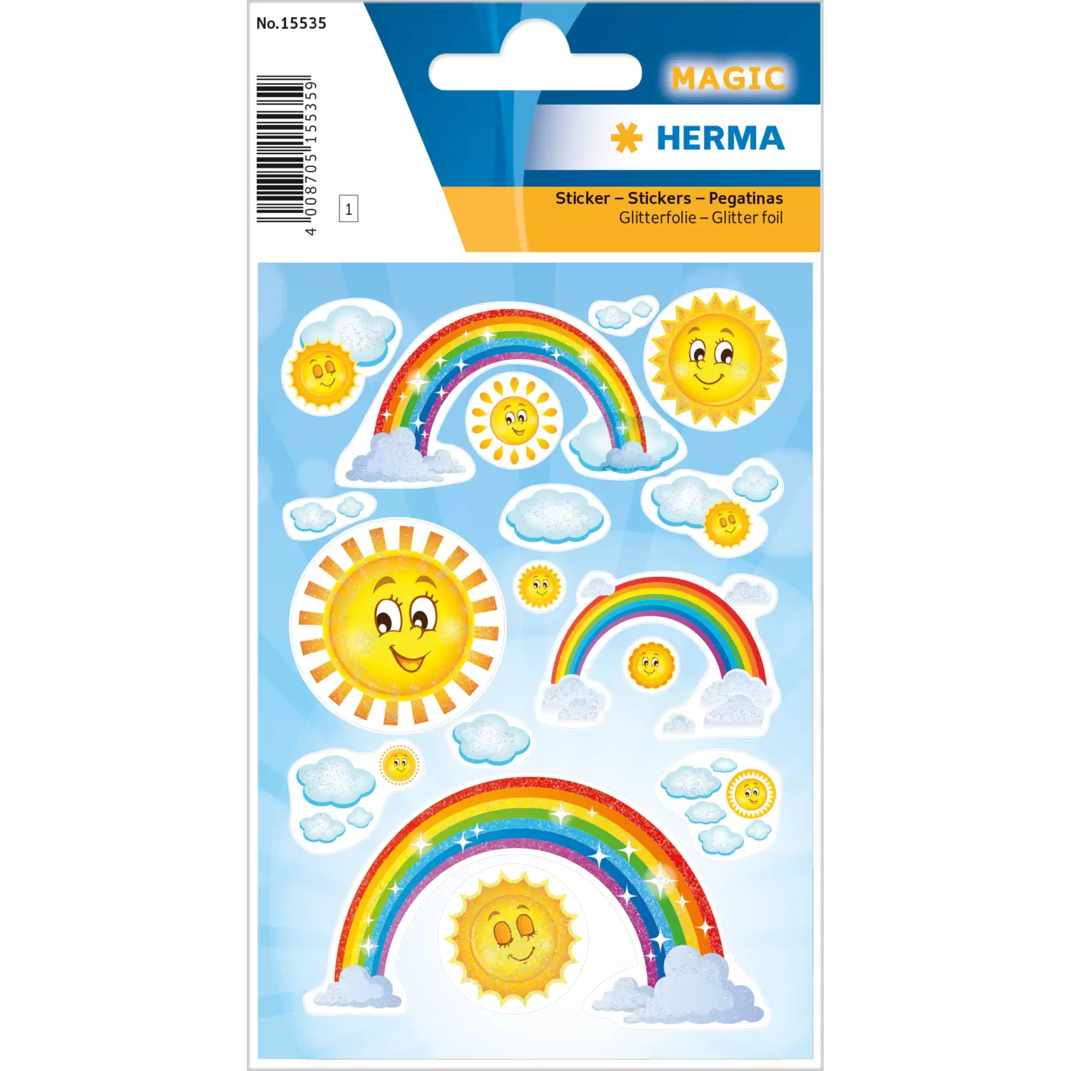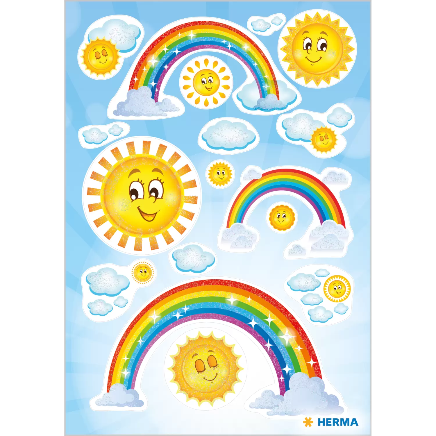 Deze prachtig vormgegeven stickers met de stralende zon, donzige wolken en schitterende regenbogen zijn versierd met fijne glitter en perfect geschikt om te verfraaien en te versieren. De stickers zijn permanent hechtend en zelfklevend op nagenoeg alle oppervlakken. Ze kunnen er heel gemakkelijk van worden verwijderd en naar believen opnieuw worden opgeplakt. Ideaal als versiering voor schriften, ordners en mappen, om te knutselen of voor sparen en ruilen.