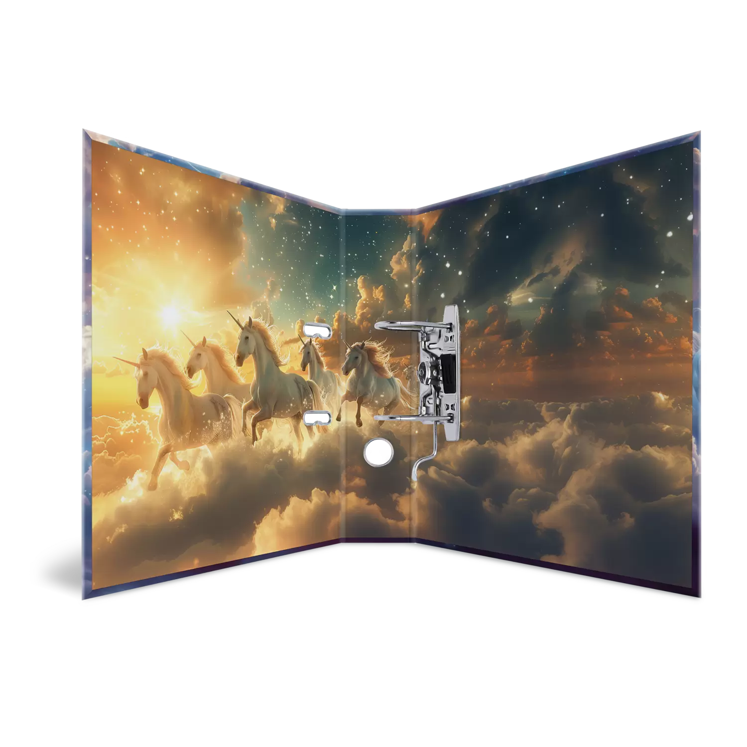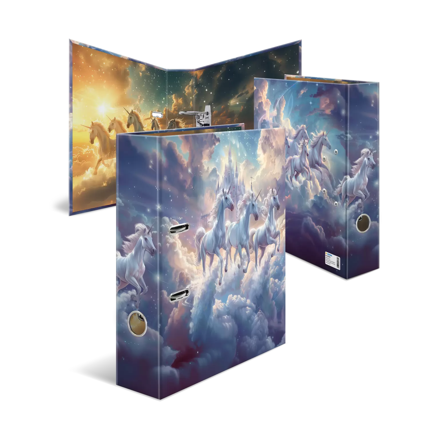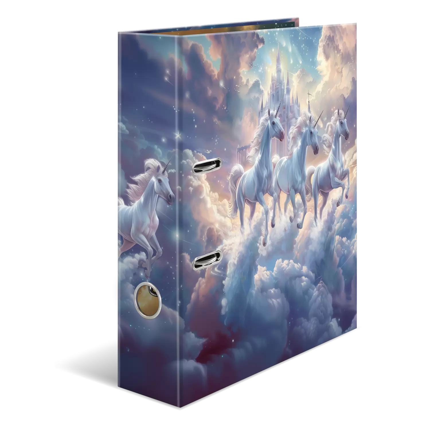 De thema-ordner "Fantasy Unicorns" tovert een wereld vol fantasie en magie in de kinder- en tienerkamers. Gracieuze eenhoorns galopperen door een zachte hemel in roze- en paarstinten, terwijl op de achtergrond een imposant kasteel het sprookjesachtige tafereel compleet maakt. Elk detail van de ordner nodigt uit om te dromen en prikkelt de verbeeldingskracht. De ordner „Fantasy Unicorns“ is niet alleen een praktische bewaarhulp voor belangrijke documenten, maar ook een inspirerend element, dat elke ruimte een vleugje magie geeft. Ideaal voor creatieve geesten en dromers.