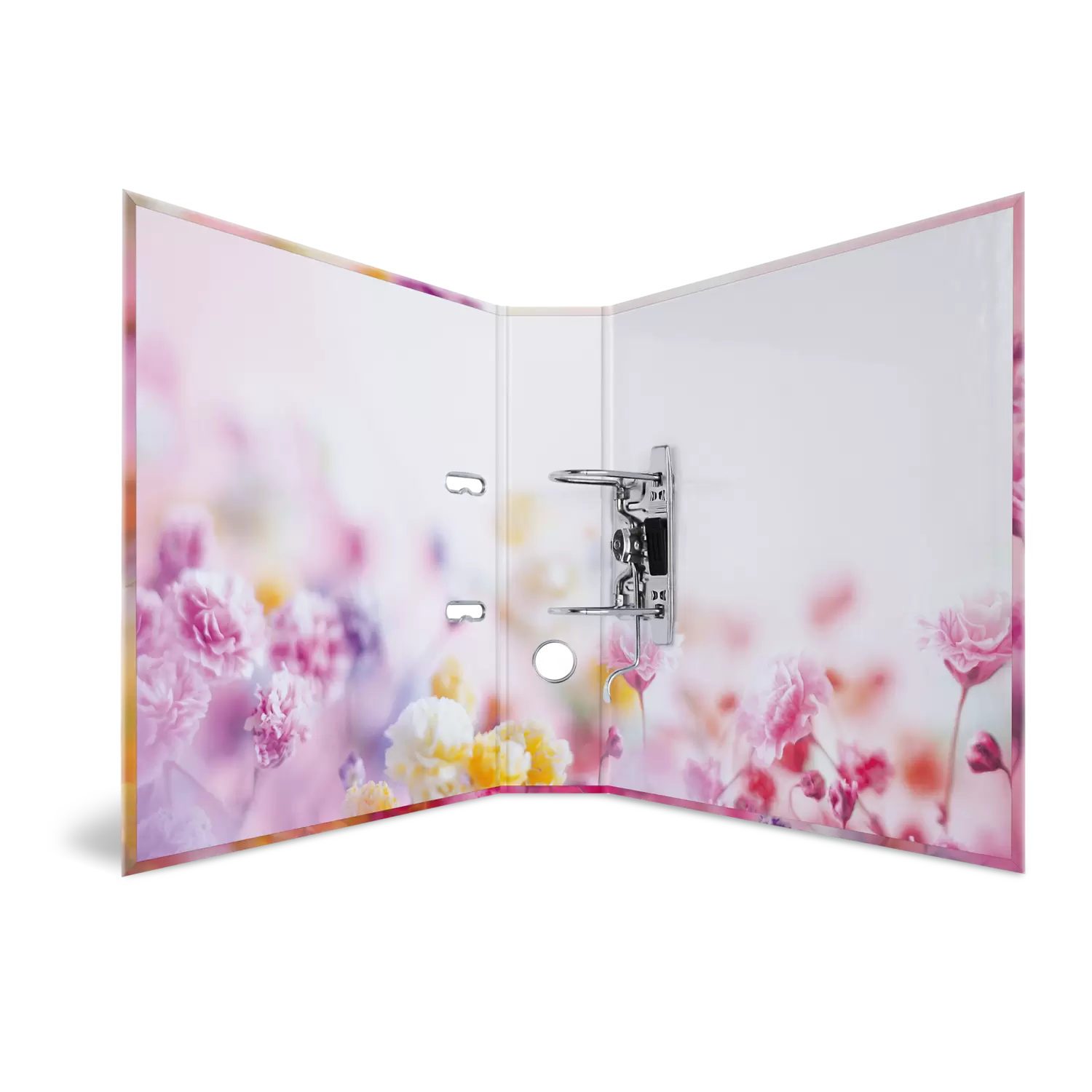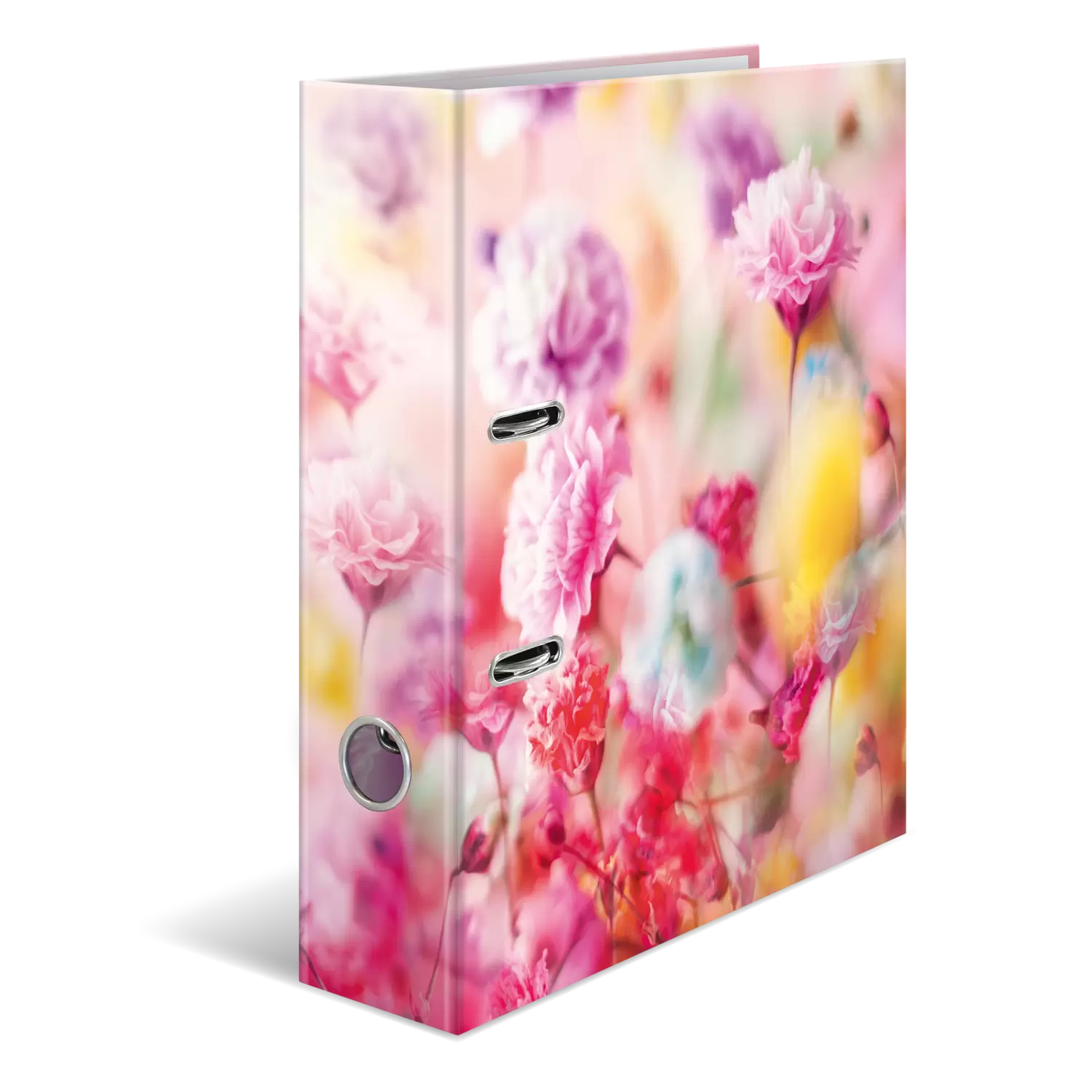 Met de HERMA thema-ordner in het design Spring Flowers uit de serie 'Flowers' haalt u de kleurenpracht van de bloemenwereld in huis, kantoor of school. Bloemen zijn niet voor niets de koninginnen van de flora: altijd al hebben ze ons gefascineerd. Ze worden omgeven door een zweem van gratie en bekoorlijkheid, waarover alleen florale schoonheden beschikken. Elke soort heeft zijn eigen kleuren, geur en aura, delicaat of sterk, discreet of uitbundig, altijd bijzonder en uniek: een cadeautje vol van kleurrijke diversiteit, een genot voor de zintuigen. Een kleurrijke voorjaarsweide, een lust voor het oog en de ziel. Het speciale hefboommechanisme met metalen klem zorgt ervoor dat de inhoud van de ordner netjes en stevig bij elkaar wordt gehouden. De brede rug garandeert dat de ordner stevig staat in de kast en voldoende plek biedt voor talloze documenten in formaten tot DIN A4.