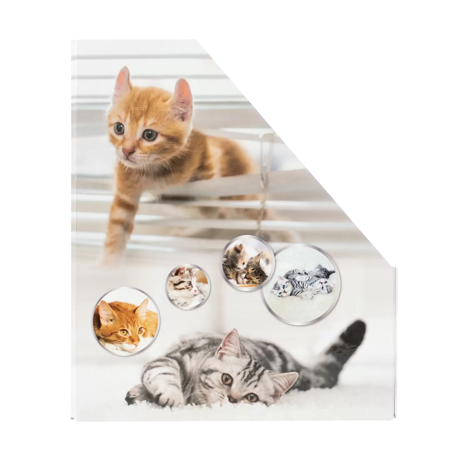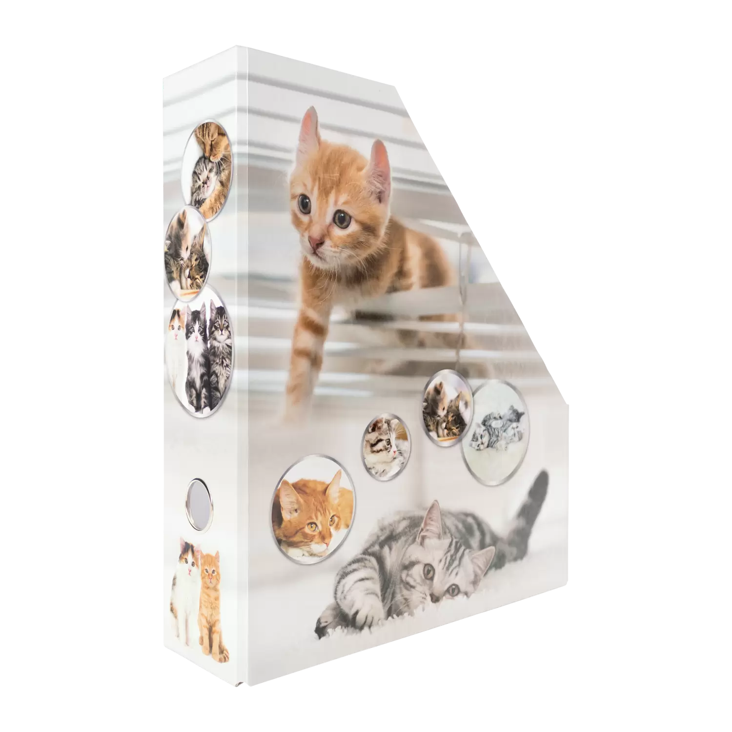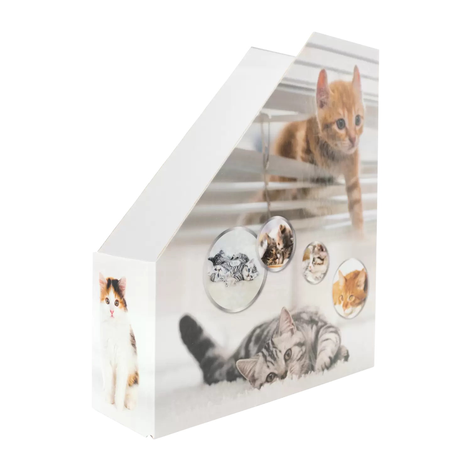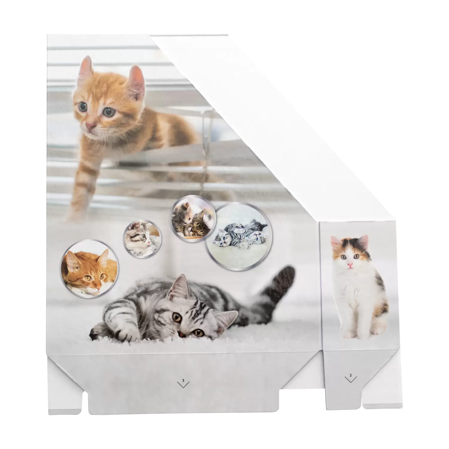 Kattenliefhebbers opgelet! In deze supergaaf ontworpen tijdschriftenhouder, die bedrukt is met leuke kattenfoto's, berg je tijdschriften, brochures, catalogi, mappen en documenten optimaal op, een sieraad in de kast en alles netjes en fraai opgeborgen en altijd bij de hand. De tijdschriftenhouder is optimaal voor tekeningen, schriften en tijdschriften in A4-formaat. Dankzij de oppervlaktecoating is hij bovendien afveegbaar en duurzaam. Praktisch en leuk om te zien, een echte blikvanger. Organiseren gemakkelijk gemaakt. Met HERMA. Ontdek de producten van de populaire kattenserie: verzamelmappen, thema-ordners, schrijfonderleggers, stickers en meer! Cool design, populair bij jong en oud – gewoon purr-fect.