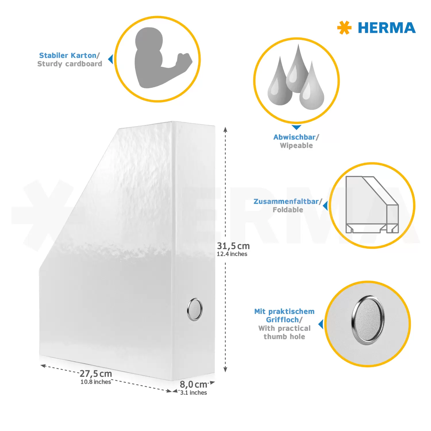 • Tijdschriftenhouder van extra stevig karton, 8 cm breed, 31,5 cm hoog en 27,5 cm diep, passend voor DIN A4-formaten