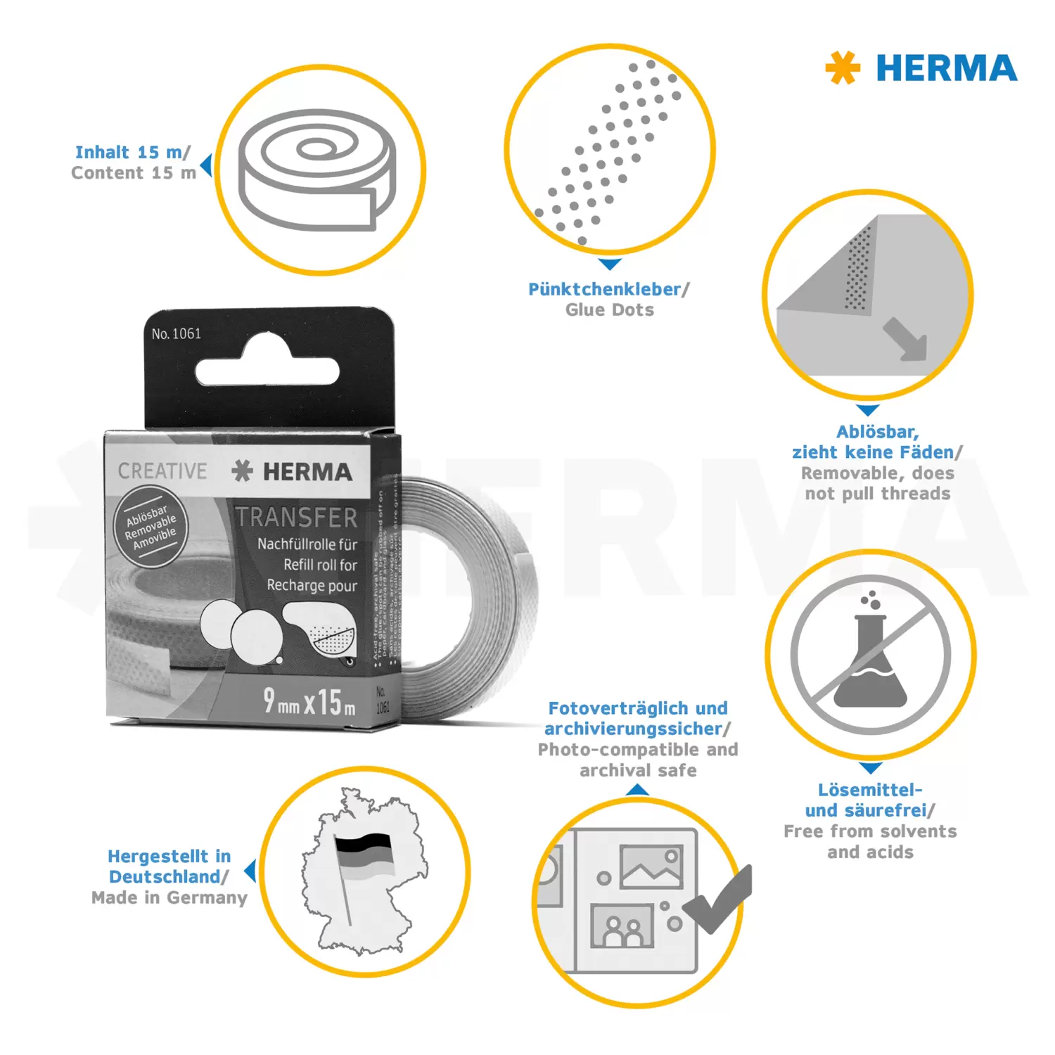 Met de praktische HERMA navulrol voor de lijmrollers Transfer verwijderbaar 1060 (zwart) en 1067 (blauw) is de dispenser nadat de rol op is snel weer klaar voor gebruik. Openen van de dispenser om de nieuwe rol aan te brengen, gaat heel gemakkelijk. Opnieuw vullen en weer gebruiken in plaats van vervangen – dat is duurzaam en milieuvriendelijk.