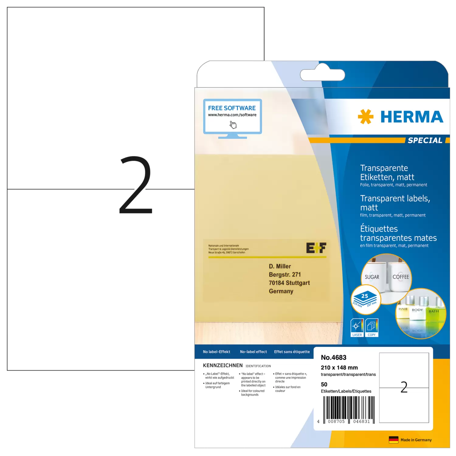 Transparante folie-etiketten mat, A4, 210 x 148 mm, weervast, permanent hechtend