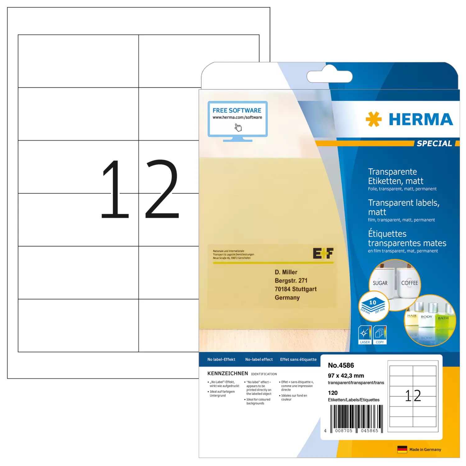 Transparante matte folie-etiketten op A4-vellen, zelfklevend. Perfect voor optisch hoogwaardige toepassingen, ideaal op een gekleurde ondergrond, glas, porselein, voor representatieve documenten, updates of om te adresseren. No-label-effect: opschrift lijkt direct opgedrukt. Weervast, verouderingsbestendig, olie en vuil afstotend, afwasbaar, temperatuurbestendig van -30 tot +80 °C. Storingvrije verwerking dankzij veiligheidsrand rondom en optimale vlakligging. Voor laserprinters en kopieerapparaten, kleurenlaserprinters en kleurenkopieerapparaten. Niet geschikt voor inkjetprinters. Gratis softwareoplossingen: www.herma.com/software.