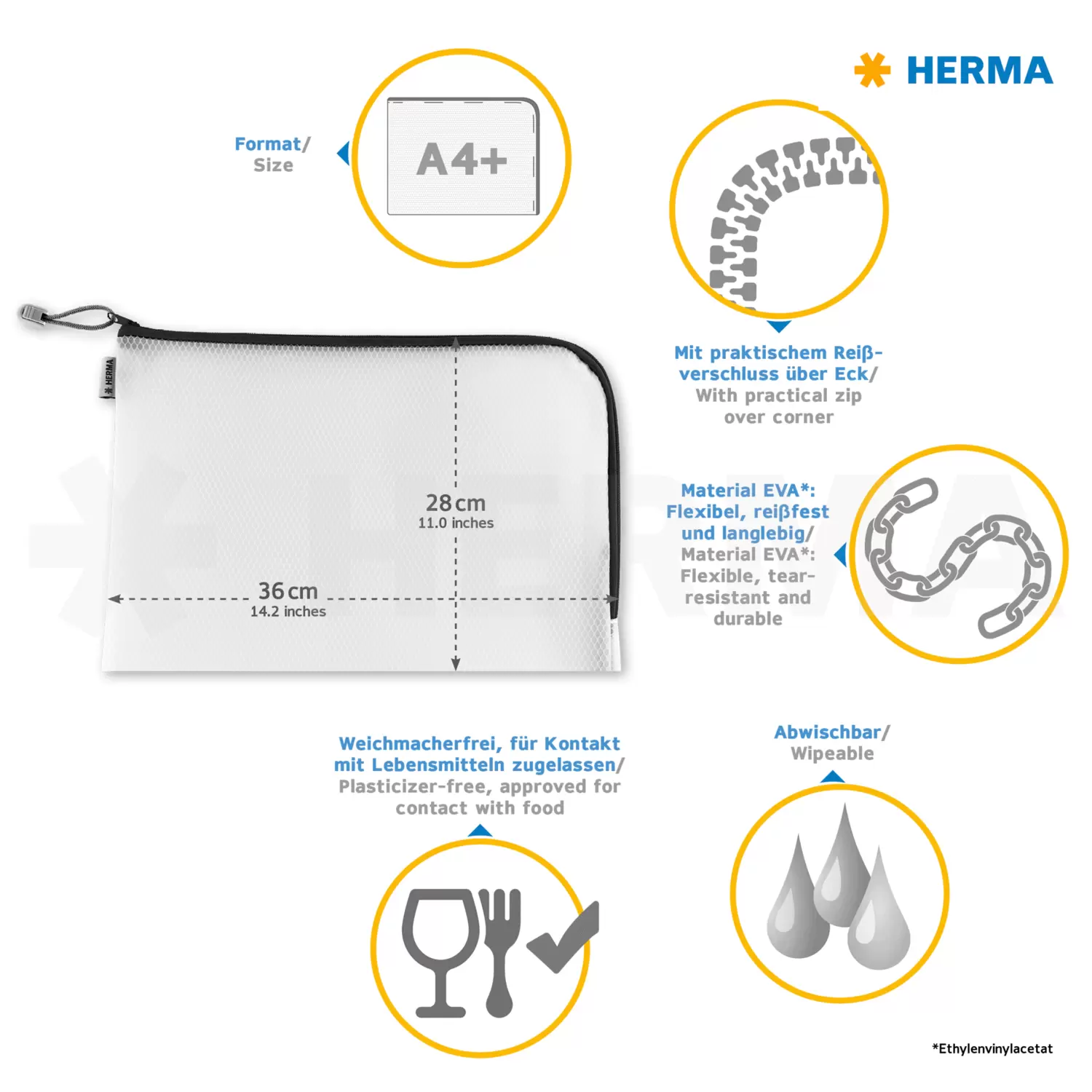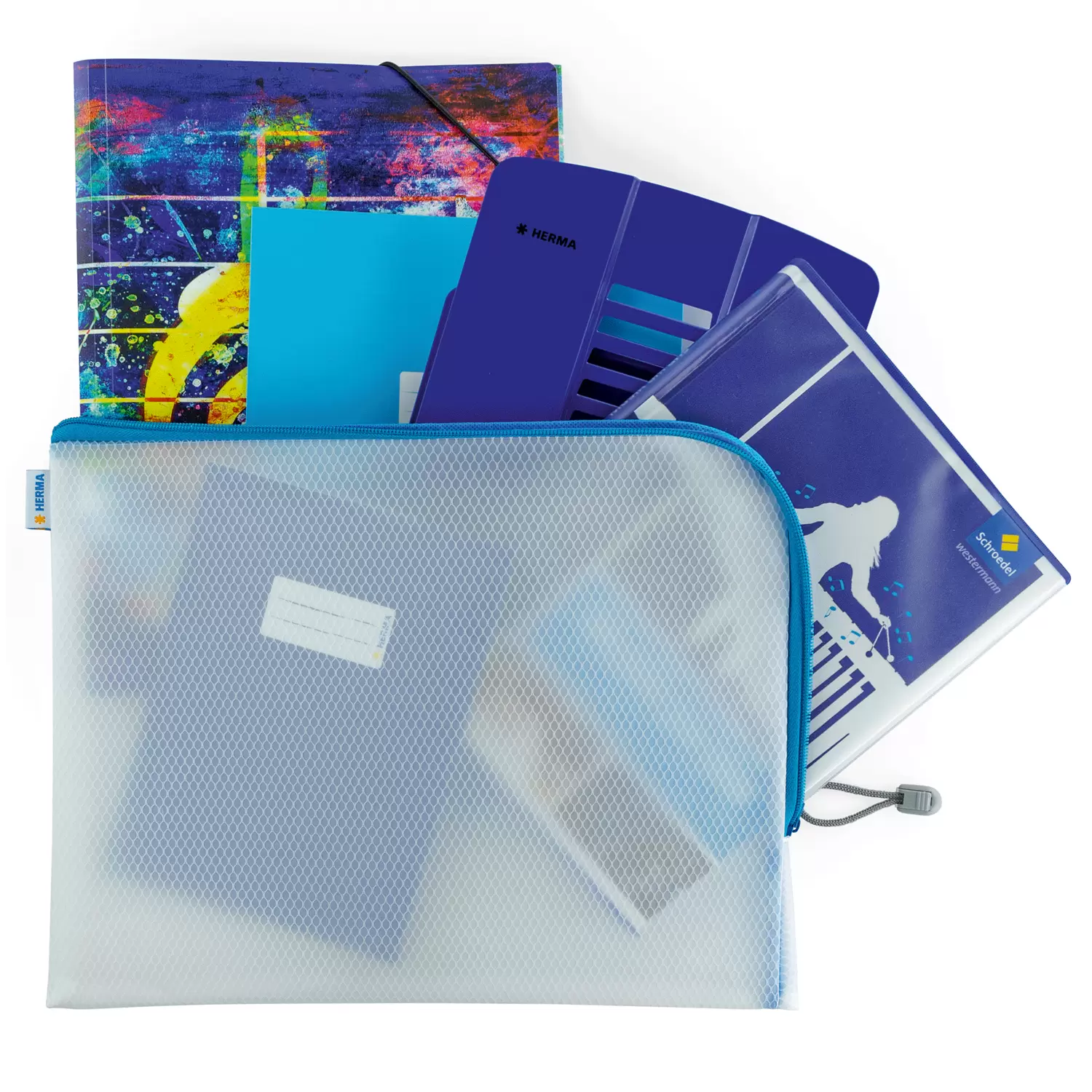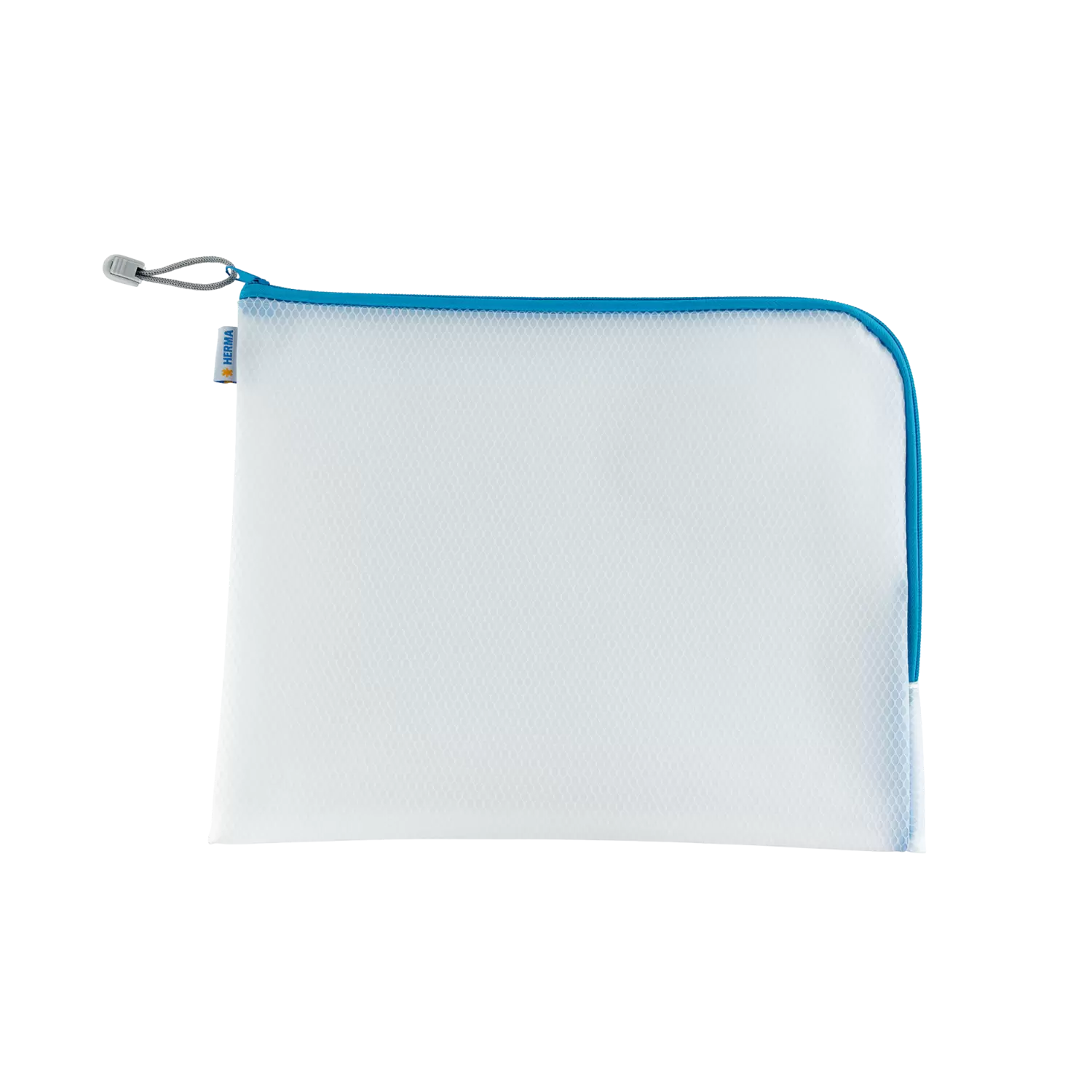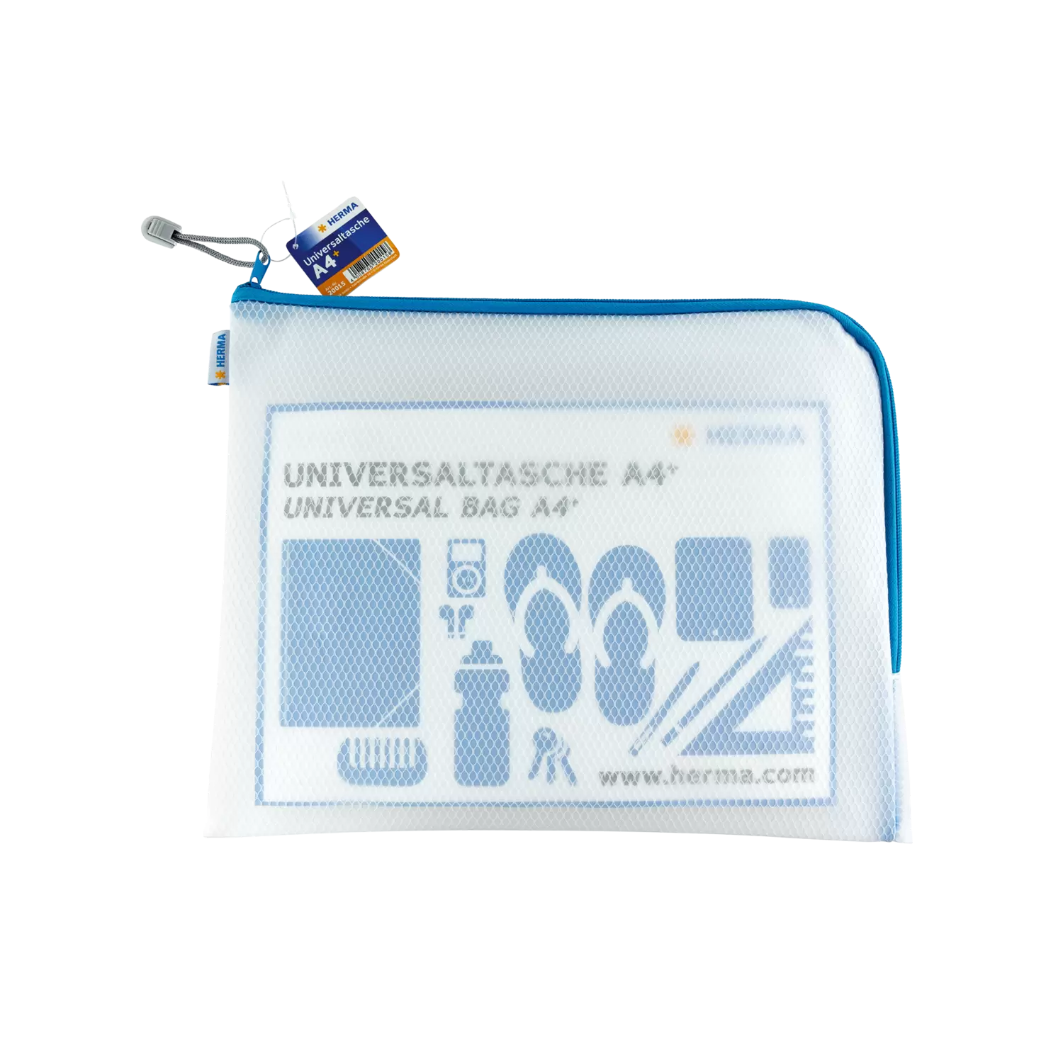 • HERMA universeel mesh-zakje A4+, met praktische ritssluiting, naden met blauwe rand, 36 x 28 cm, duurzaam materiaal.