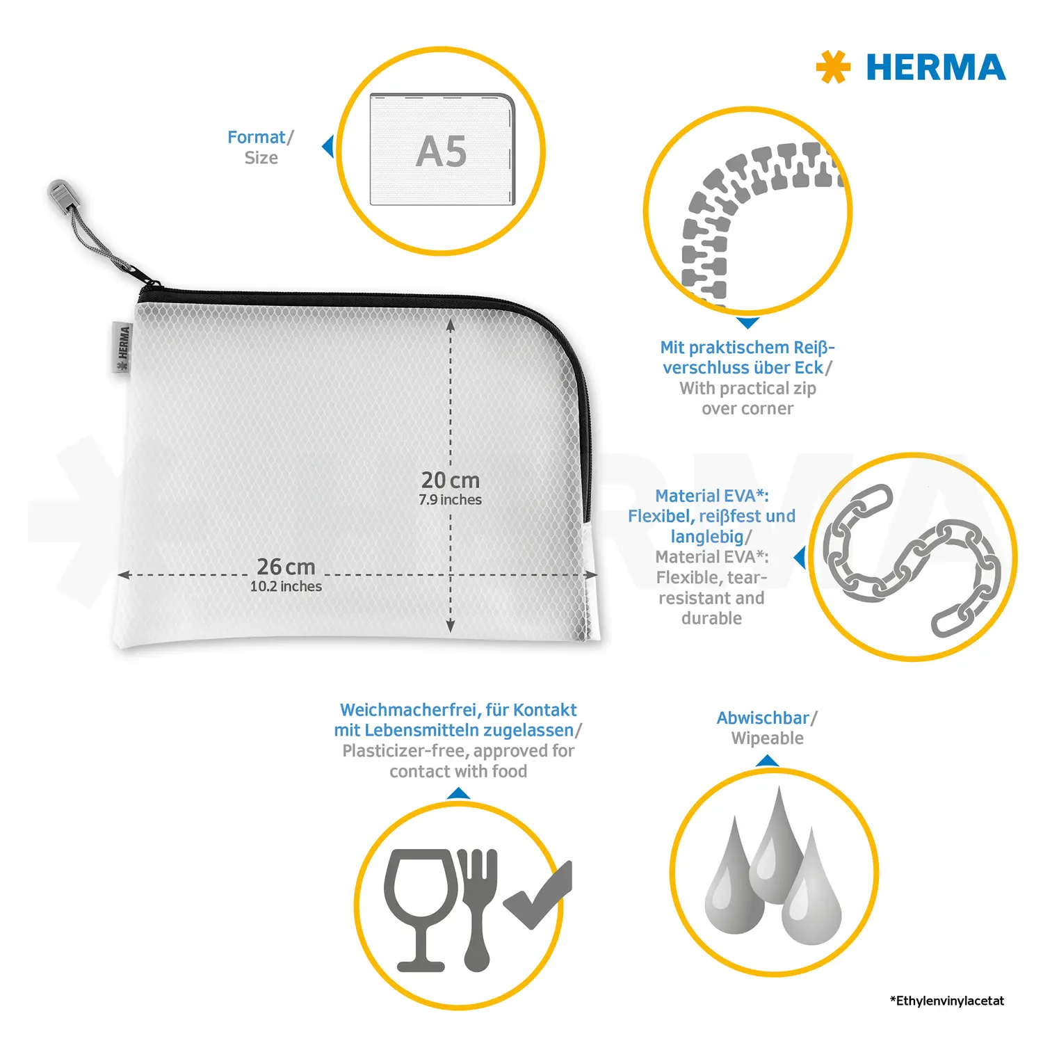 Het HERMA universele mesh-zakje A5, 26 x 20 cm, rode rand, met praktische ritssluiting aan twee zijden, is er ook in de kleuren blauw, geel, groen en oranje. Het halfdoorzichtige mesh-zakje is voor veel doeleinden superhandig: voor verzamelen, sorteren, archiveren. Op reis voor documenten of als strandtasje voor zwembroek, bikini en zonnebrandcrème, voor A5-schriften en notitieboekjes voor school en universiteit of voor de mobiele telefoon, het oplaadsnoer en sleutels of voor veel dingen in de werkplaats – eenvoudig perfect voor elk bewaardoel. De stevige rasterversterkte en transparante folie biedt zicht op de inhoud en beschermt perfect tegen externe invloeden, zoals verontreinigingen, vuil en vocht. Het materiaal wordt gekenmerkt door zijn bijzondere bestendigheid en is slijtvast. Het opberg- en sorteerwonder is nog in twee andere formaten verkrijgbaar.