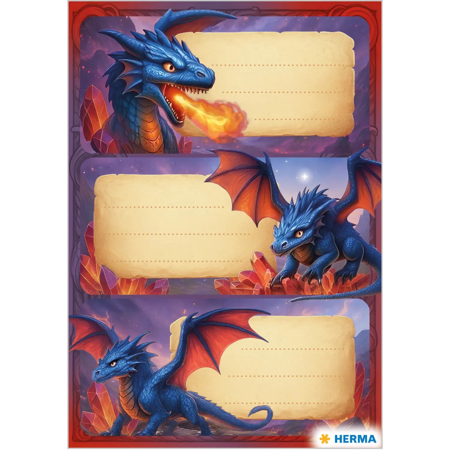 Nu wordt het spannend! De gevaarlijke, magische draken zijn los en staan in volledige grootte op de schooletiketten perfect voor alle fantasieliefhebbers! De etiketten met het ontwerp “Dragon” in het formaat 76x35 mm combineren design en functionaliteit. Gewoon de zelfklevende papieren stickers snel en eenvoudig met de hand beschrijven, verwijderen, opplakken klaar. Zo kunnen boeken en schriften op school, in de kleuterschool en onder vrienden niet meer door elkaar worden gehaald.