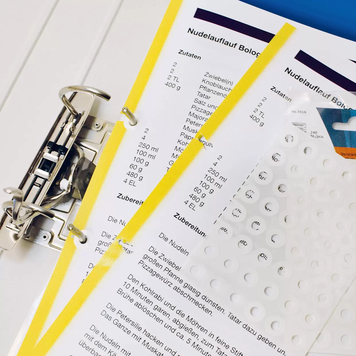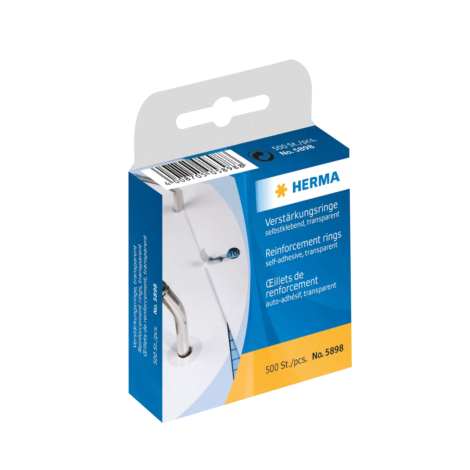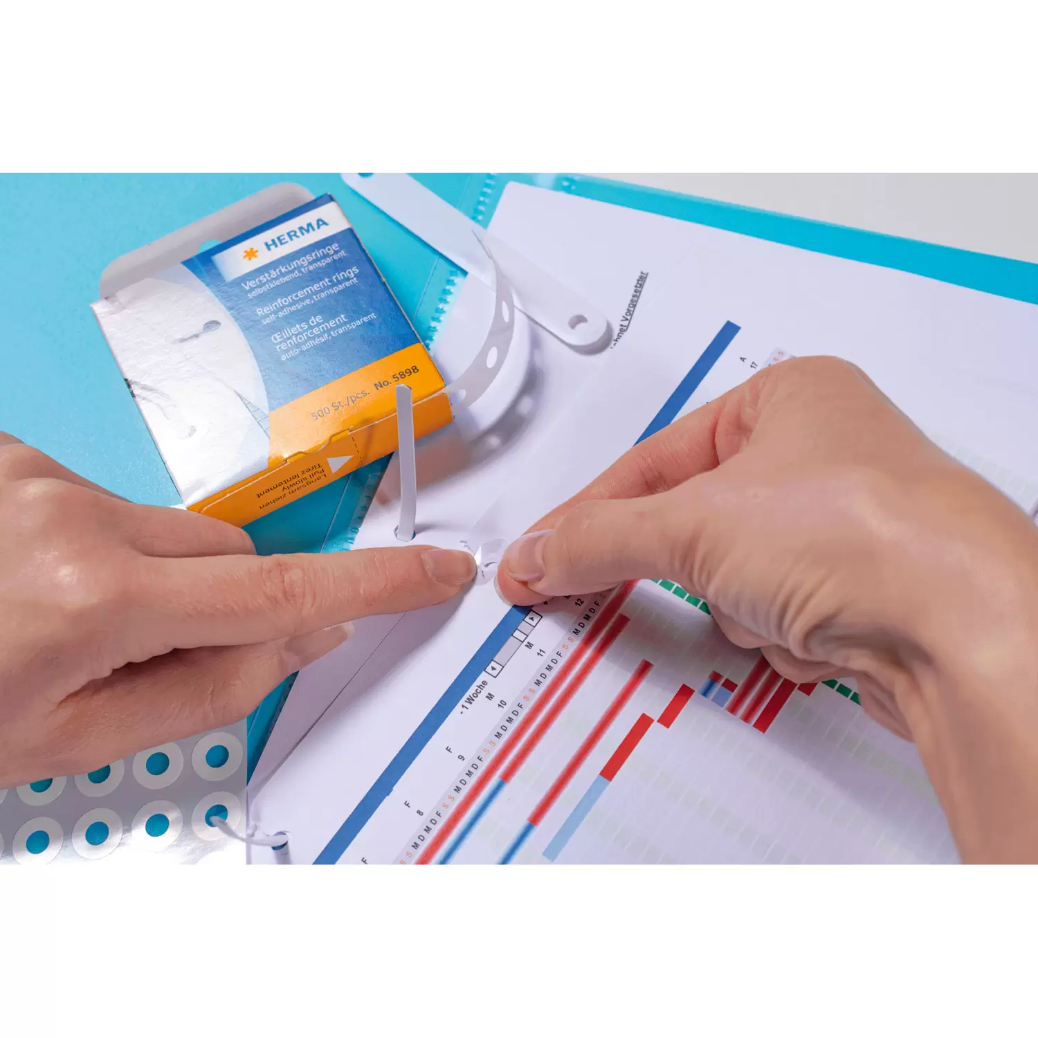 Zelfklevende versterkingsringen van scheurvrije kunststof folie, voorhet repareren van uitgescheurde perforaties. Buitenmaat: doorsnede 12 mm. In kartonnen dispenser.