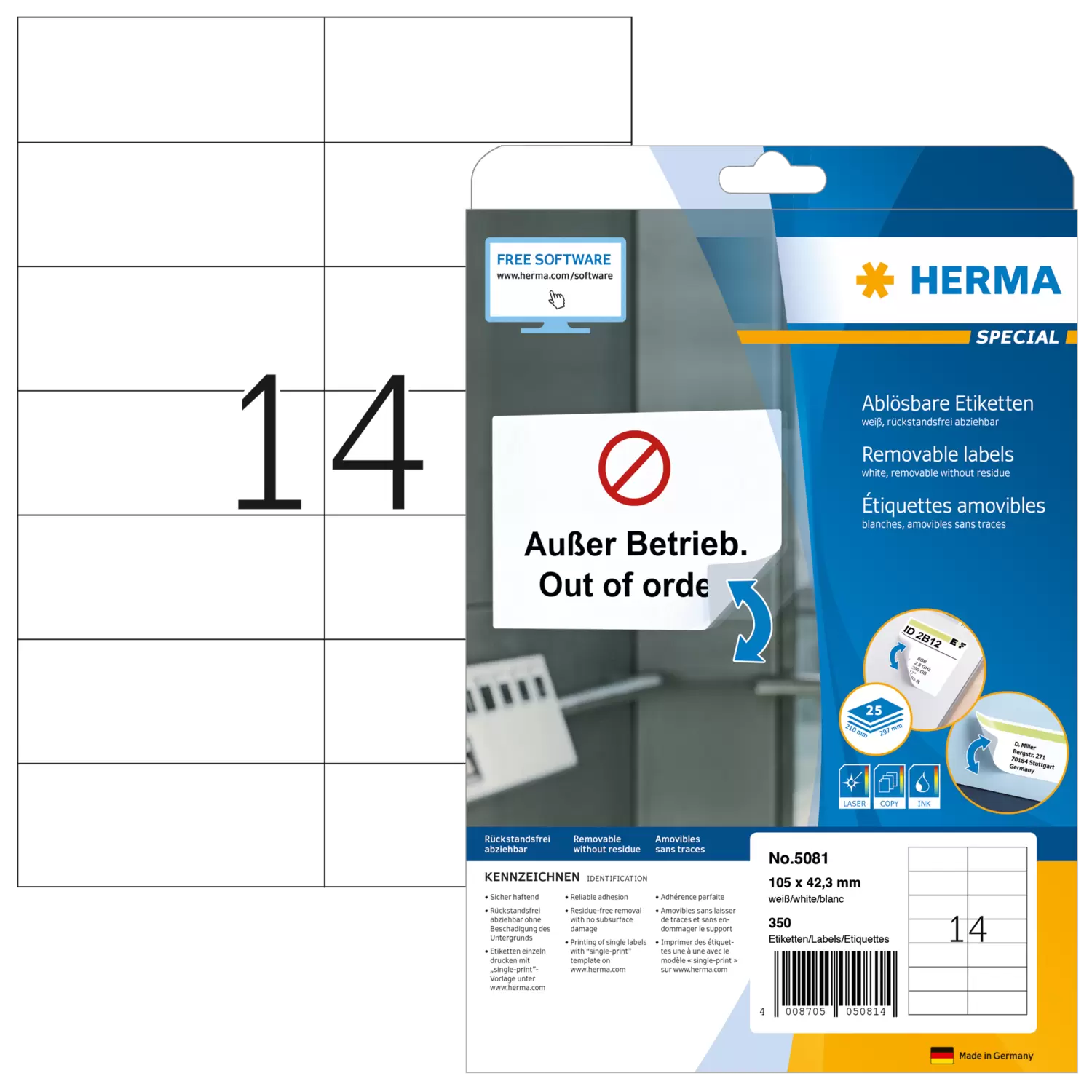 Verwijderbare etiketten, A4, 105 x 42,3 mm, wit