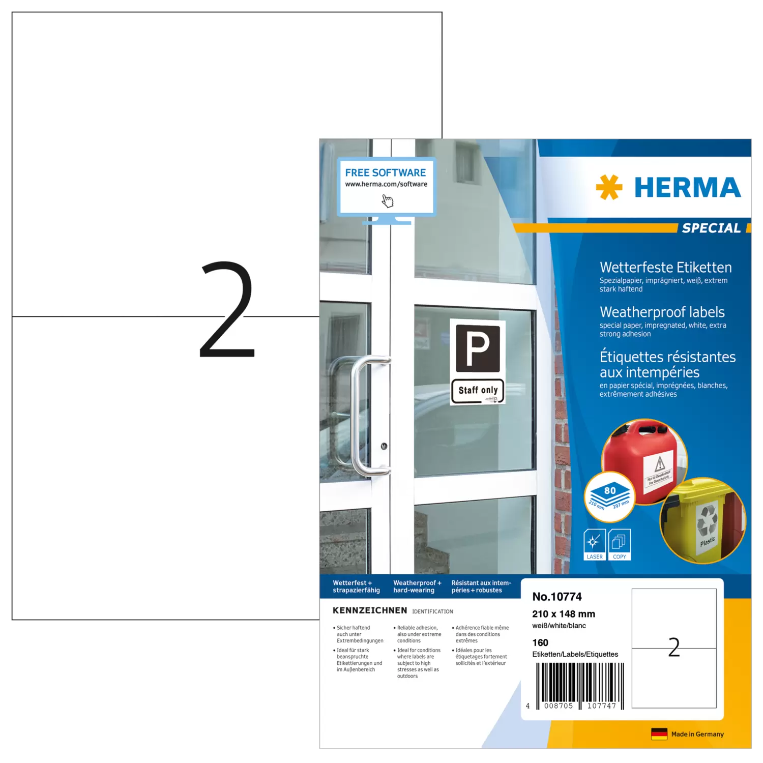 Etiketten van weerbestendig speciaal papier, zelfklevend. Van geïmpregneerd, wit speciaal papier, extreem sterk hechtend, ook op kritische oppervlakken. Ideaal voor etiketten op zwaar belaste plaatsen en buiten. Water, olie en vuil afstotend, verouderingsbestendig, zeewaterbestendig. Temperatuurbestendig van -30 tot 80 °C. Ondergrondmateriaal van chloorvrij gebleekte celstof, oplosmiddelvrije contactlijm. Voor laserprinters en kopieermachines. Niet geschikt voor inkjetprinters, kleurenlaserprinters en kleurenkopieerapparaten. Gratis softwareoplossingen: www.herma.com/software.