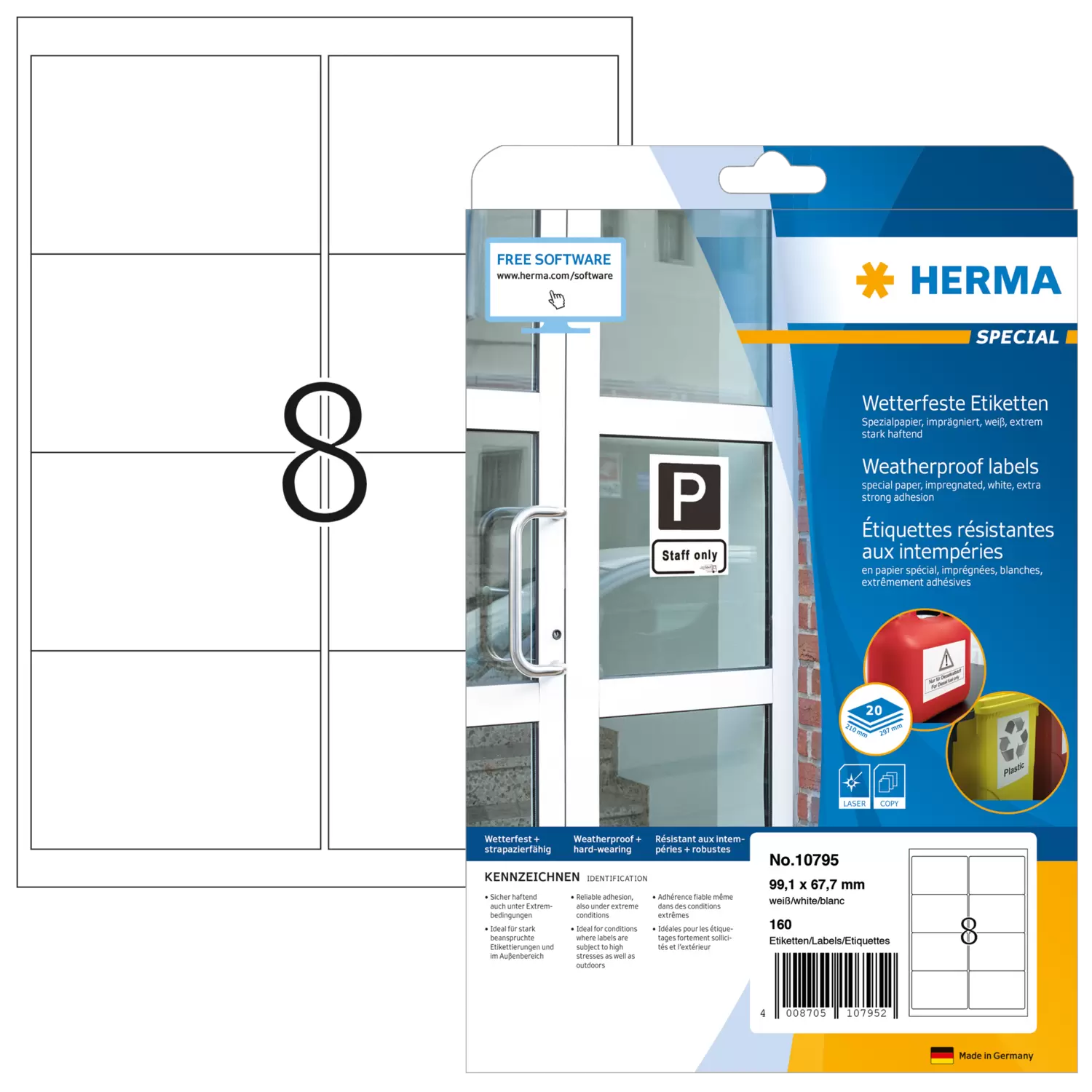 Etiketten van weerbestendig speciaal papier, zelfklevend. Van geïmpregneerd, wit speciaal papier, extreem sterk hechtend, ook op kritische oppervlakken. Ideaal voor etiketten op zwaar belaste plaatsen en buiten. Water, olie en vuil afstotend, verouderingsbestendig, zeewaterbestendig. Temperatuurbestendig van -30 tot 80 °C. Ondergrondmateriaal van chloorvrij gebleekte celstof, oplosmiddelvrije contactlijm. Voor laserprinters en kopieermachines. Niet geschikt voor inkjetprinters, kleurenlaserprinters en kleurenkopieerapparaten. Gratis softwareoplossingen: www.herma.com/software.