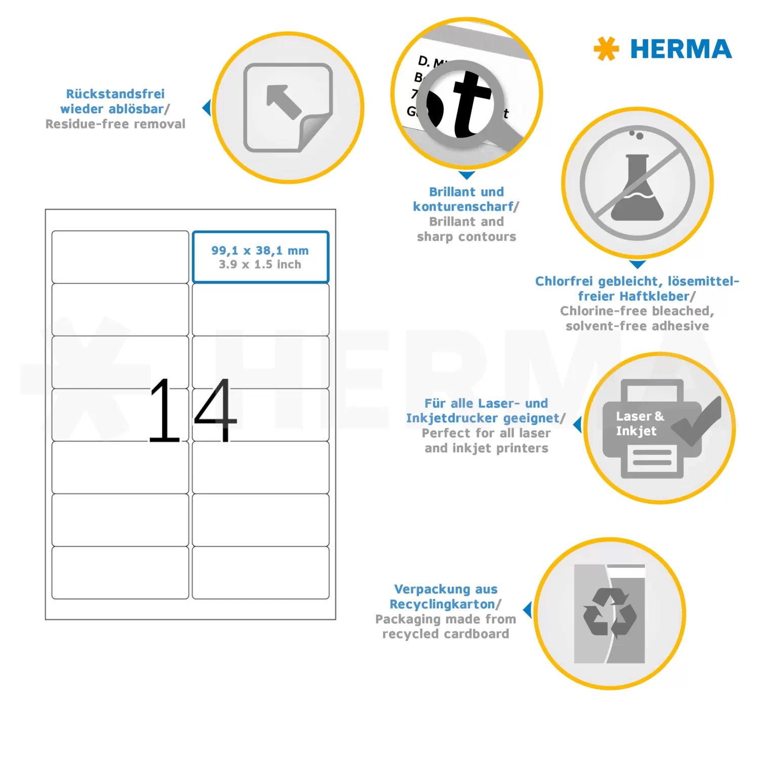 Zelfklevende etiketten op A4-vellen. Stevig hechtend op alle gladde, droge, onbeschadigde en stofvrije oppervlakken. Te verwijderen zonder resten achter te laten en zonder de ondergrond te beschadigen. Ideaal voor het tijdelijk of wisselend labelen en voor oppervlakken die niet mogen worden beschadigd. Zeer goede drukresultaten op alle laser- en inkjetprinters, kopieerapparaten, kleurenlaserprinters en kleurenkopieerapparaten. Storingvrije verwerking dankzij veiligheidsrand rondom en optimale vlakligging. Milieuvriendelijk: FSC® Mix Credit-gecertificeerd, chloorvrij gebleekt, oplosmiddelvrije contactlijm. Etiketten zijn 100 % recyclebaar via het oud papier, verpakking van gerecycled karton. Gratis softwareoplossingen: www.herma.com/software.