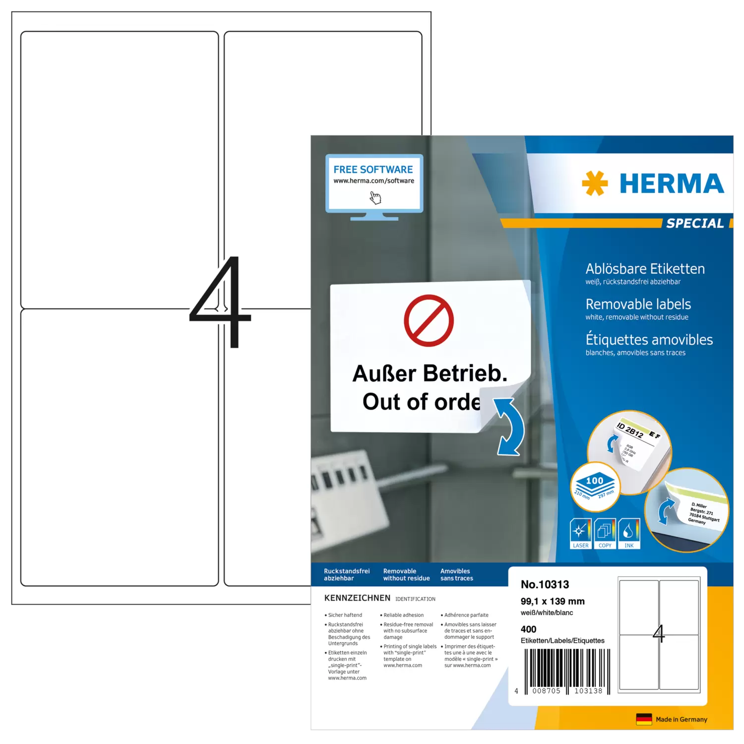 Zelfklevende etiketten op A4-vellen. Stevig hechtend op alle gladde, droge, onbeschadigde en stofvrije oppervlakken. Te verwijderen zonder resten achter te laten en zonder de ondergrond te beschadigen. Ideaal voor het tijdelijk of wisselend labelen en voor oppervlakken die niet mogen worden beschadigd. Zeer goede drukresultaten op alle laser- en inkjetprinters, kopieerapparaten, kleurenlaserprinters en kleurenkopieerapparaten. Storingvrije verwerking dankzij veiligheidsrand rondom en optimale vlakligging. Milieuvriendelijk: FSC® Mix Credit-gecertificeerd, chloorvrij gebleekt, oplosmiddelvrije contactlijm. Etiketten zijn 100 % recyclebaar via het oud papier, verpakking van gerecycled karton. Gratis softwareoplossingen: www.herma.com/software.