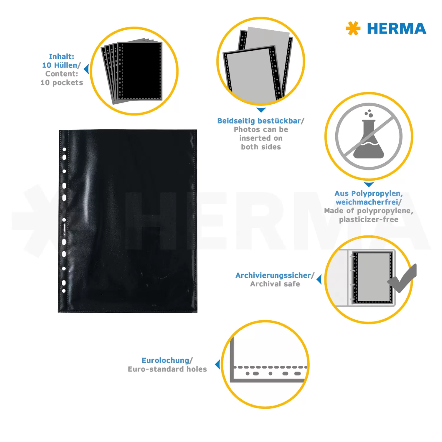 De HERMA Fotophan transparante fotohoesjes zijn de praktische organizers en archiveringshulpmiddelen voor foto's, prentjes, ansichtkaarten, toegangskaartjes en nog veel meer. Gewoon in de transparante vakjes steken en meteen is alles goed opgeborgen - ongecompliceerd en helemaal zonder lijmen! De transparante fotohoesjes zijn gemaakt van stevig wit polypropyleen, met aan weerszijden opgesealde helder-transparante steekvakjes voor foto's tot een formaat van 20 x 30 cm. Zo kunnen 2 foto's per hoesje goed en beschermd worden bewaard. De hoesjes zijn absoluut weekmakervrij en archiveringsbestendig, zonder chemische inwerking op de foto's. Elke verpakking bevat 10 hoesjes met plek voor 20 foto's. Dankzij de praktische europerforatie kunnen ze in alle gangbare ordners, albums en ringbanden voor DIN A4-formaten worden opgeborgen. Ideaal zijn de HERMA Fotobooks, verkrijgbaar in 5 prachtige kleuren. Perfecte bescherming, absoluut vrij van vuil, vouwen of vingerafdrukken.