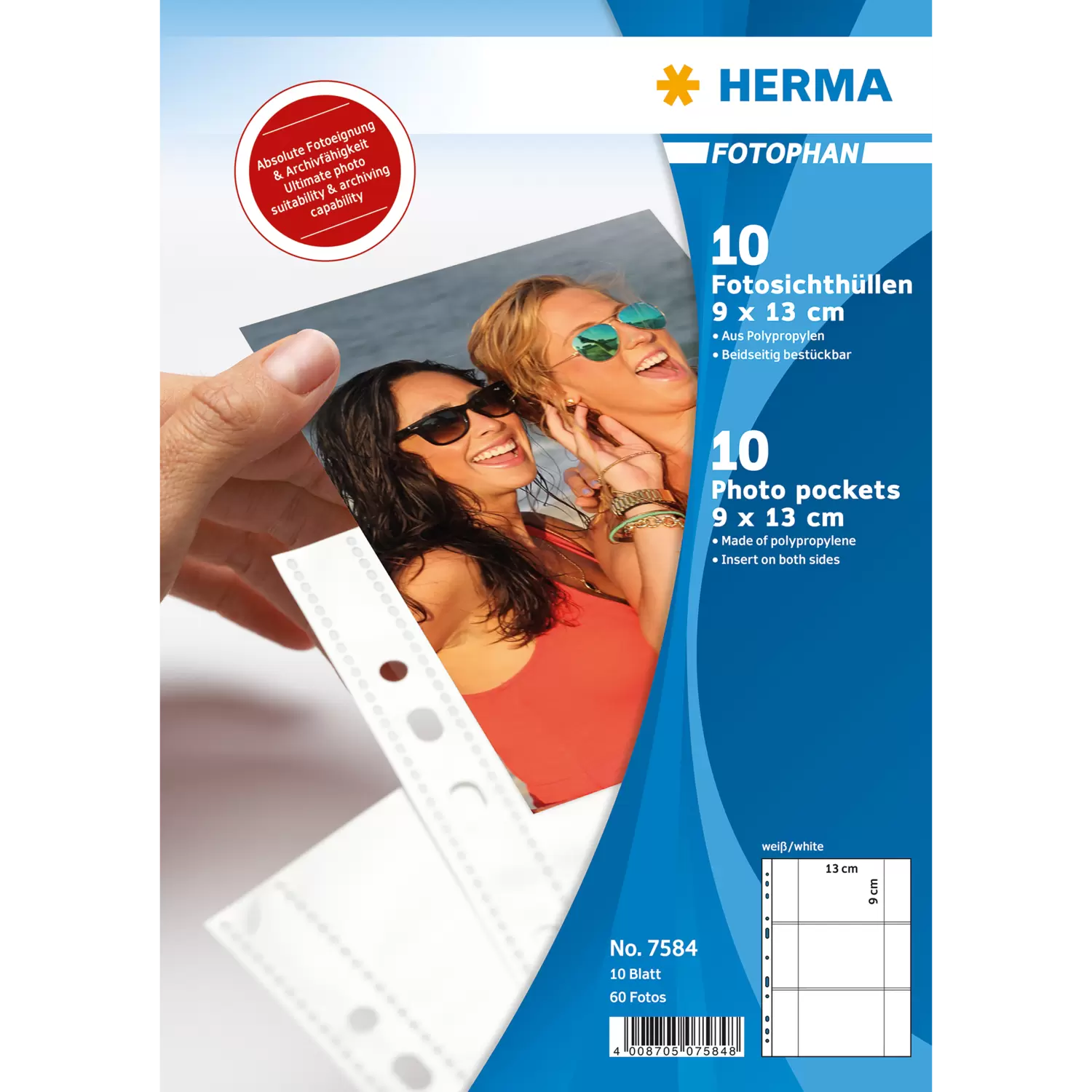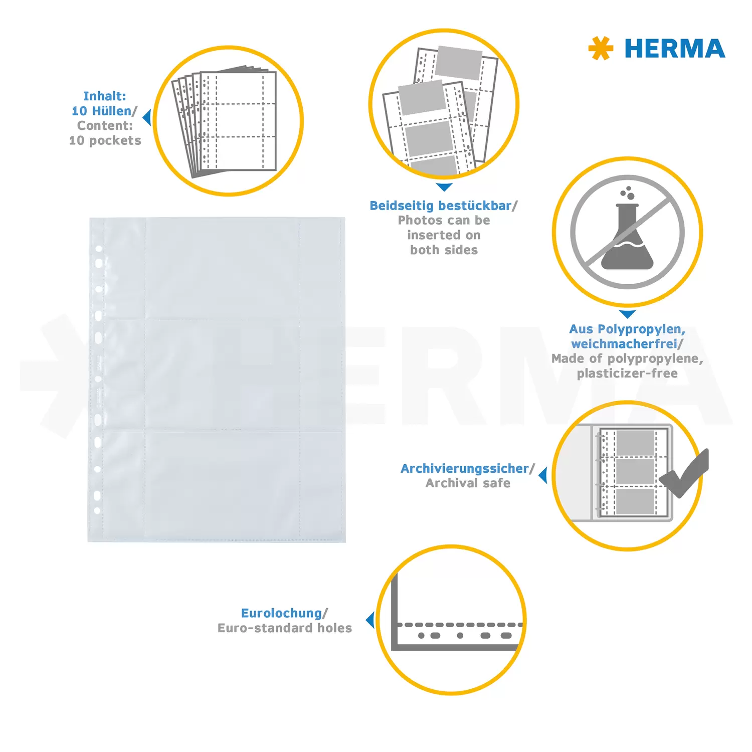 De HERMA Fotophan transparante fotohoesjes zijn de praktische organizers en archiveringshulpmiddelen voor foto's, prentjes, ansichtkaarten, toegangskaartjes en nog veel meer. Gewoon in de transparante vakjes steken en meteen is alles goed opgeborgen - ongecompliceerd en helemaal zonder lijmen! De transparante fotohoesjes zijn gemaakt van stevig wit polypropyleen, met aan weerszijden opgesealde helder-transparante steekvakjes voor foto's tot 9 x 13 cm liggend formaat. Zo kunnen 6 foto's per hoesje goed en beschermd worden bewaard. De hoesjes zijn absoluut weekmakervrij en archiveringsbestendig, zonder chemische inwerking op de foto's. Elke verpakking bevat 10 hoesjes met plek voor 60 foto's. Dankzij de praktische europerforatie kunnen ze in alle gangbare ordners, albums en ringbanden voor DIN A4-formaten worden opgeborgen. Ideaal zijn de HERMA Fotobooks, verkrijgbaar in 5 prachtige kleuren. Perfecte bescherming, absoluut vrij van vuil, vouwen of vingerafdrukken.