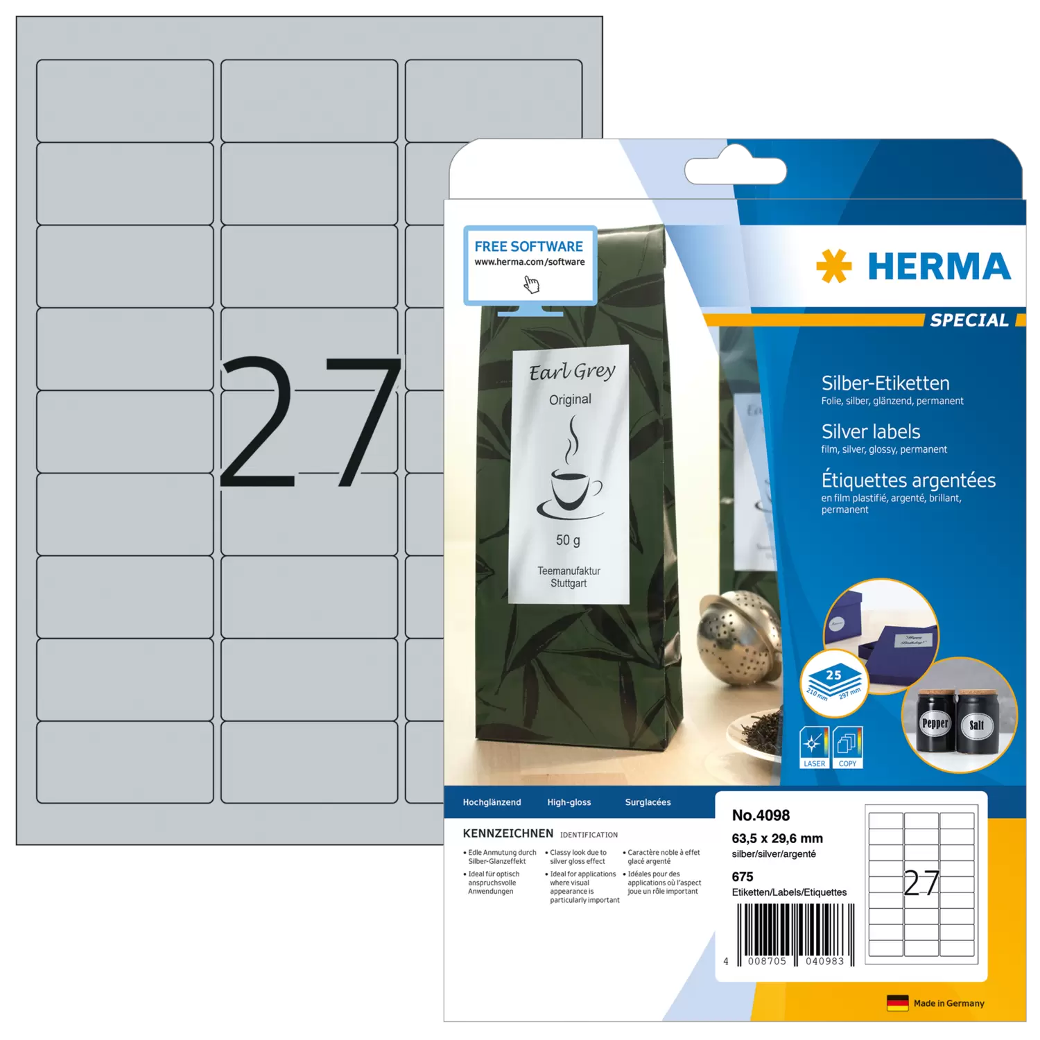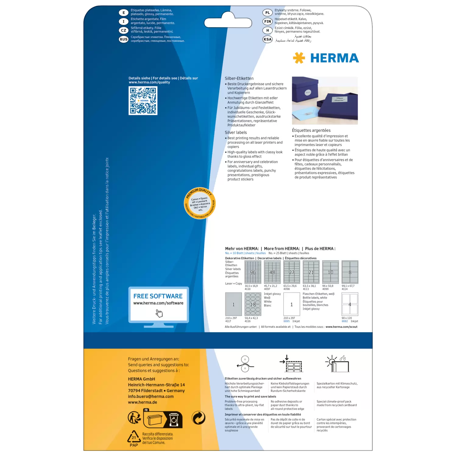 Zilverkleurige oppervlakken van glanzende polyesterfolie, op A4-vellen, zelfklevend. Exclusief en glanzend, voor jubileums- en feestetiketten, individuele geschenken, veelzeggende presentaties, representatieve productstickers. Watervast en vuil afstotend, goed hechtend op alle oppervlakken. Storingvrije verwerking dankzij veiligheidsrand rondom en optimale vlakligging. Voor laserprinters en kopieerapparaten, kleurenlaserprinters en kleurenkopieerapparaten. Niet geschikt voor inkjetprinters. Gratis softwareoplossingen: www.herma.com/software.